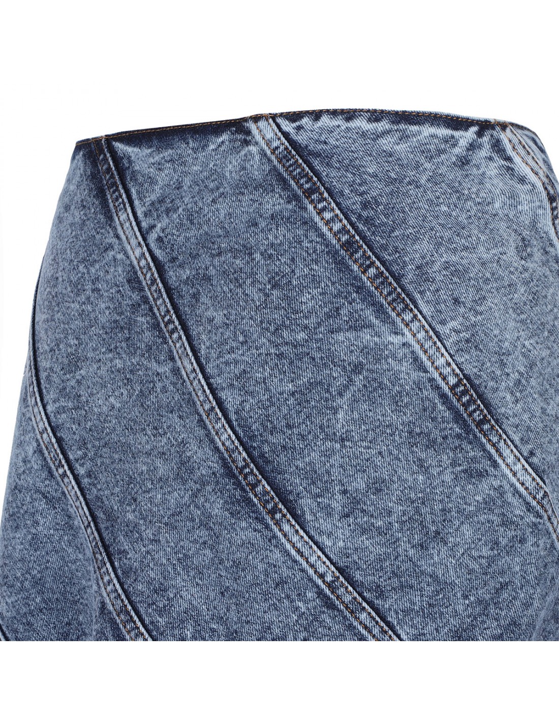 Blue denim spiral midi skirt from Alaia featuring fading, flared silhouette, asymmetric ruched hem, stitching pattern, side zip closure.