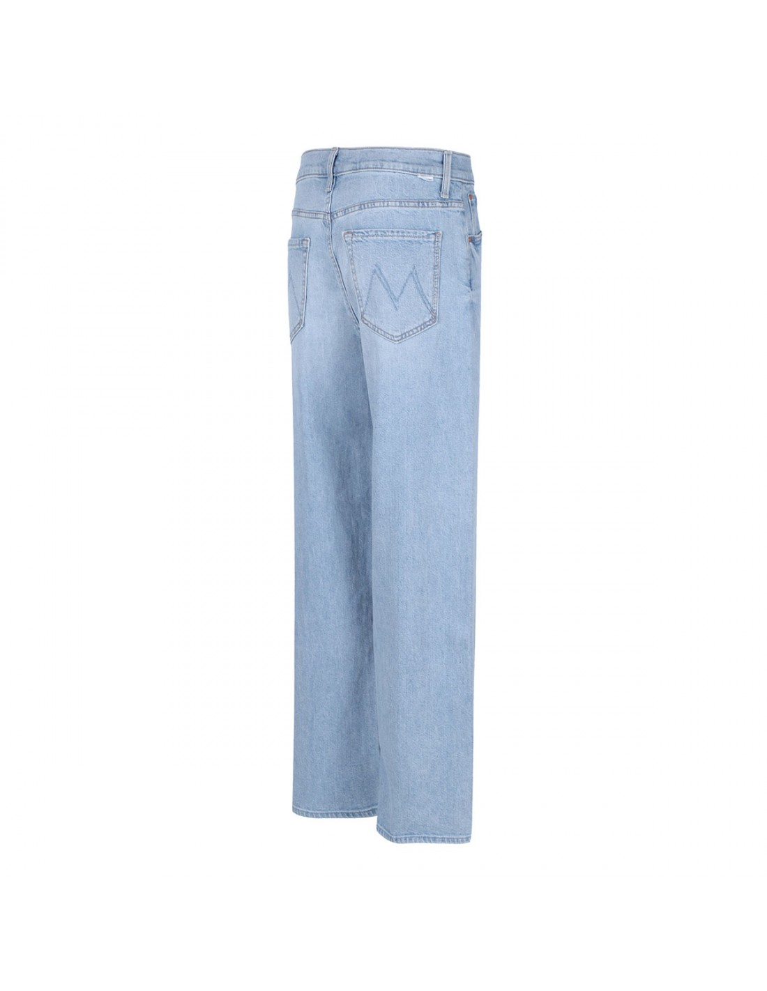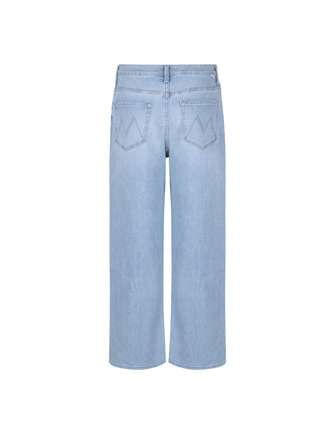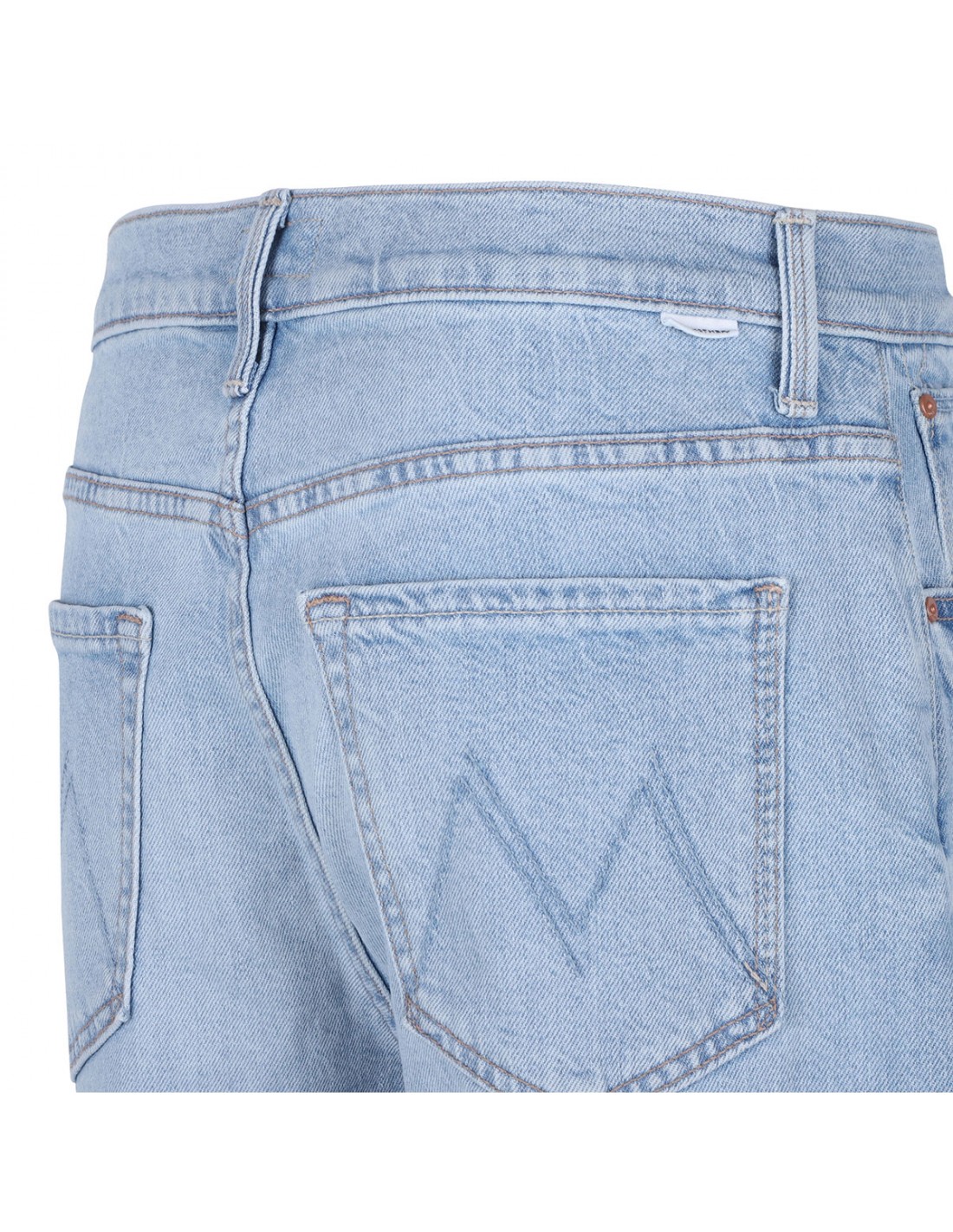 Light-blue rigid denim The Dodger Ankle jeans from Mother featuring loose straight leg, whiskering at the knees, ankle-length, button closure, zip fly, belt loops on the waistband, M logo embroidery on back.