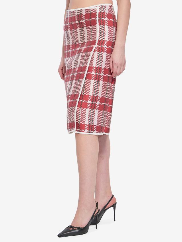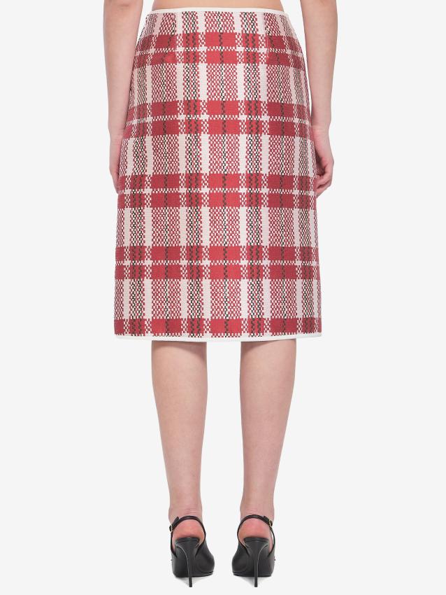 Knee-length skirt in a polyester, polyamide, and silk blend with a red, white, and black checkered pattern. It features a hidden side zip closure, a