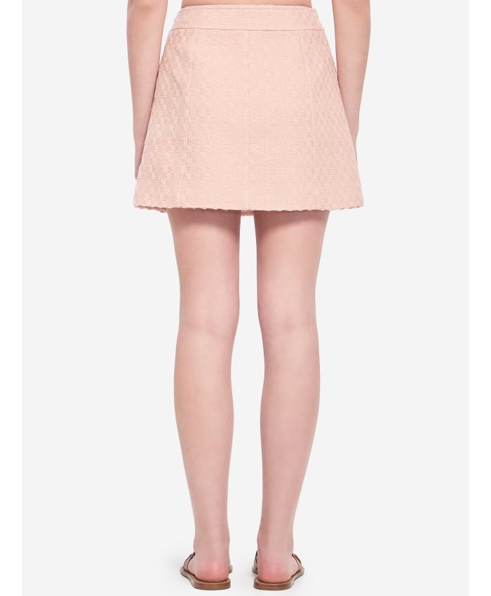 Mini trapeze skirt in pastel pink wool blend with a textured weave. It features a concealed zip and hook-and-eye closure.The model is 178cm tall and