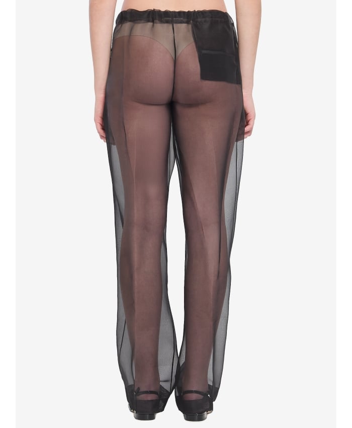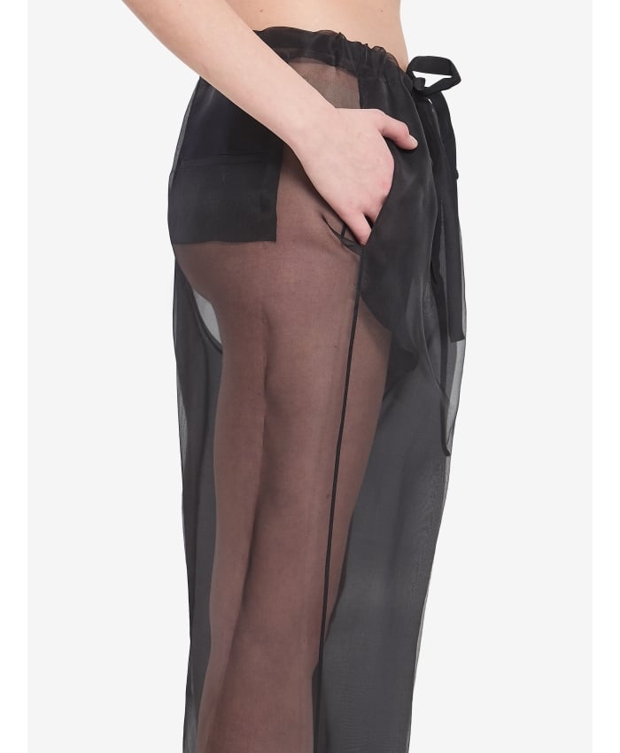 Trenton pants in sheer black silk organza. They feature a grommeted drawstring closure, two in-seam side pockets, a single welt back pocket, and wide