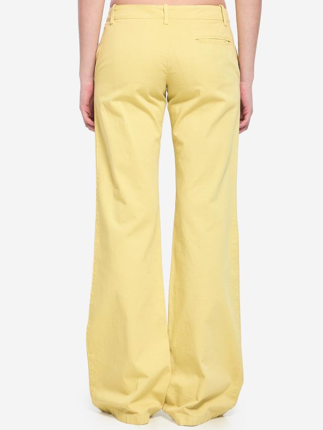Low-rise trousers in yellow cotton. They feature a button closure, two side pockets, one welt back pocket, belt loops, and flared legs. Any