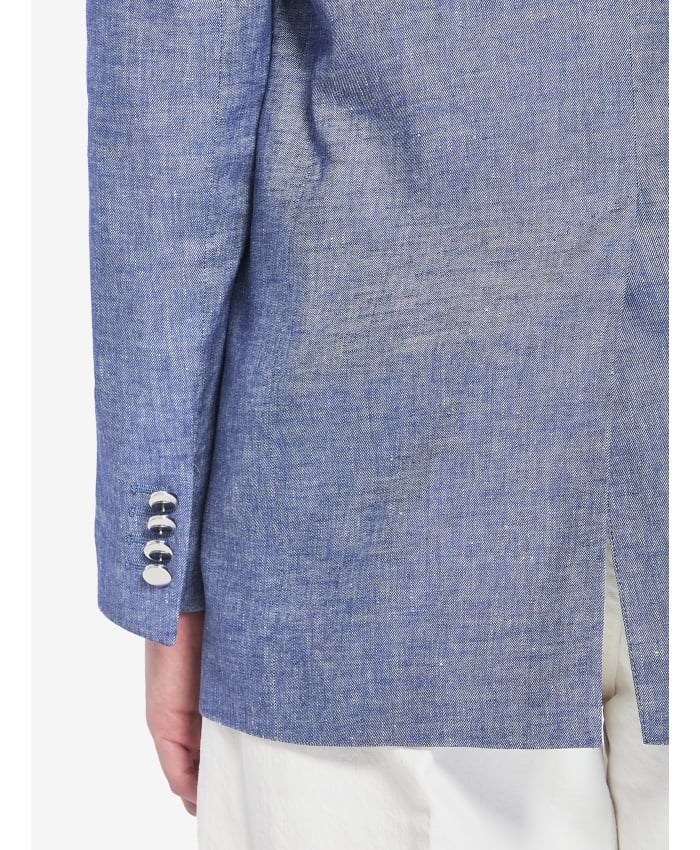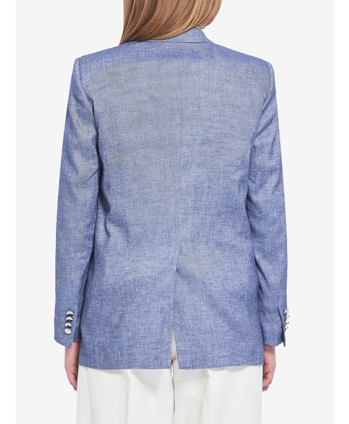 Double-breasted jacket in a linen and viscose blend in light blue. It features peak lapels, a double-breasted closure with silver buttons, two front