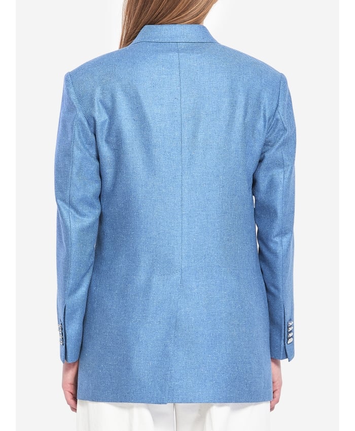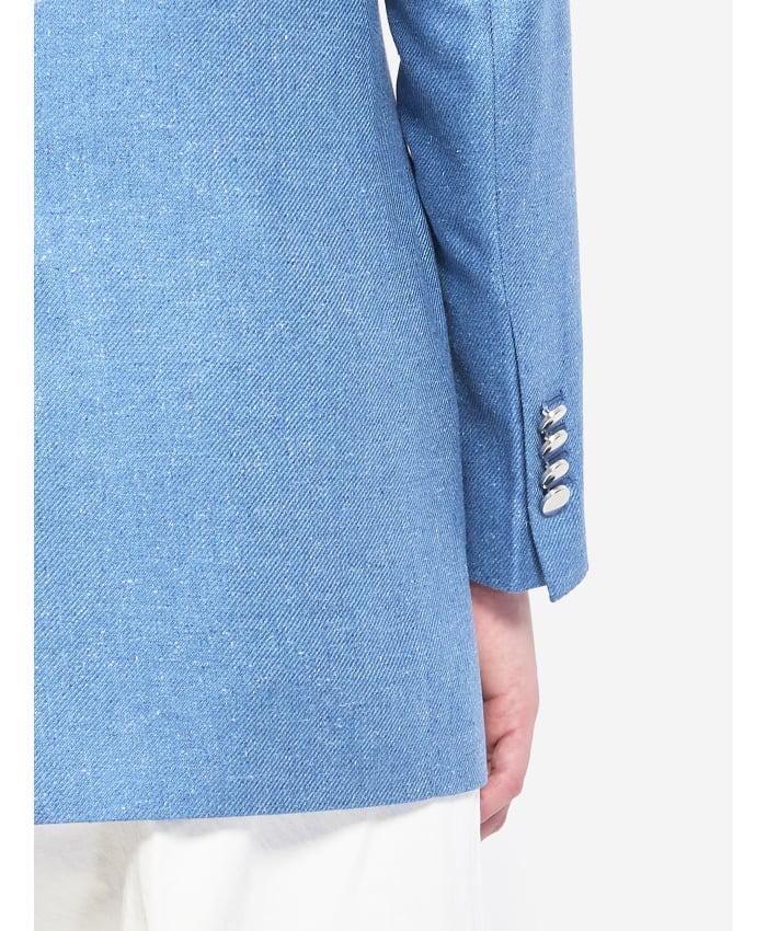 Single-breasted jacket in light blue silk. It features peak lapels, a single-breasted button closure, a chest pocket, two front flap pockets,