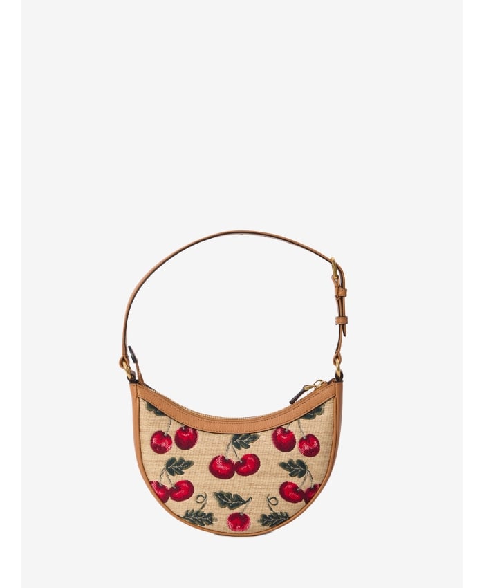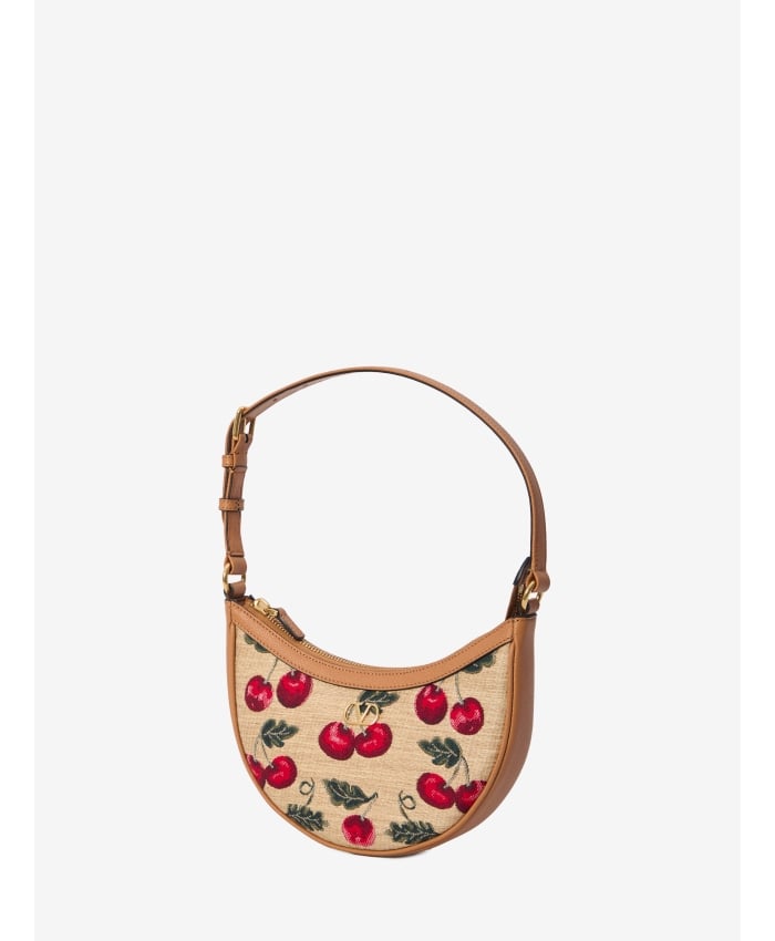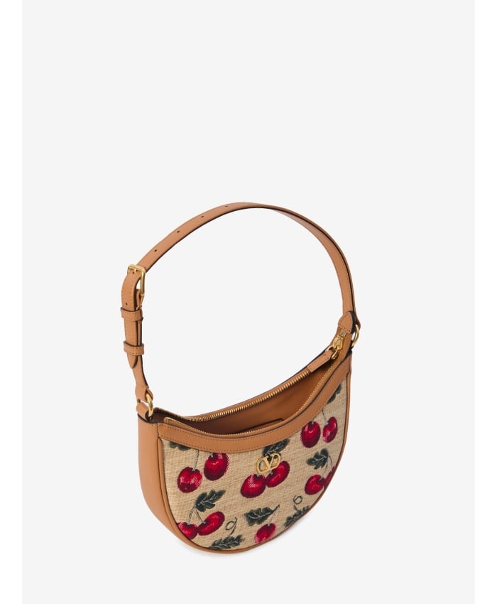 Mini hobo bag in synthetic raffia Jacquard with Cherryfic pattern and brown leather trims. It features an adjustable leather top handle, VLogo