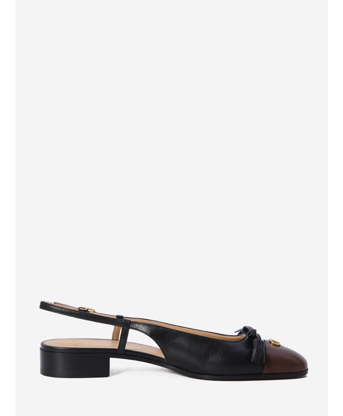 Valet Du Roi slingback ballet flats in two-tone black and coffee kidskin. They feature a round coffee leather toe, antique brass-finish metal VLogo