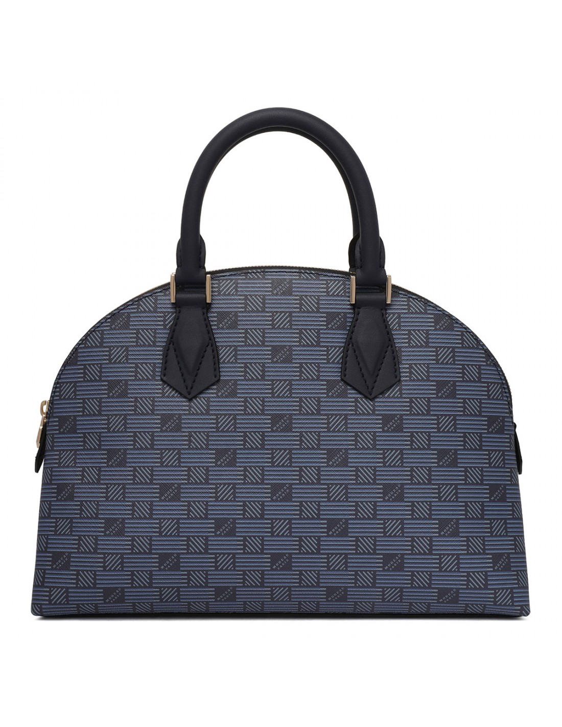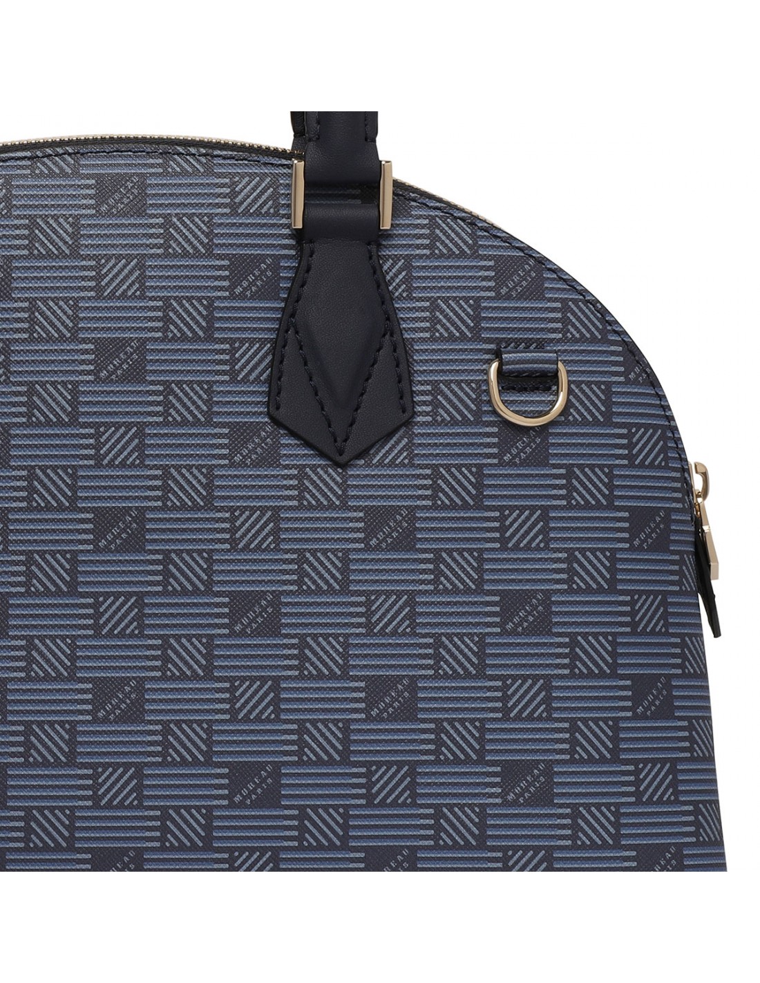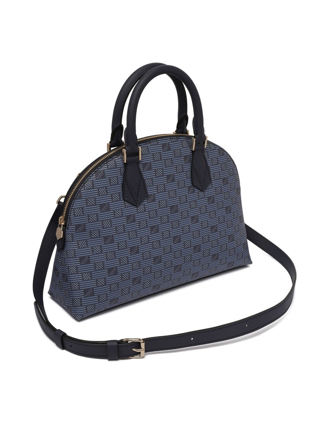 Navy blue signature Bionet canvas Reina medium handbag from Maison Moreau featuring eco-calf detail, zip closure, double leather top handle, detachable and adjustable leather shoulder strap, internal pocket