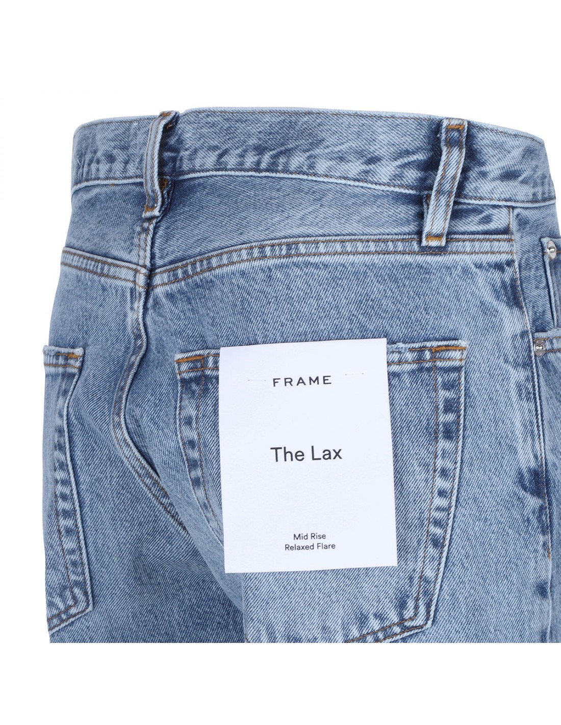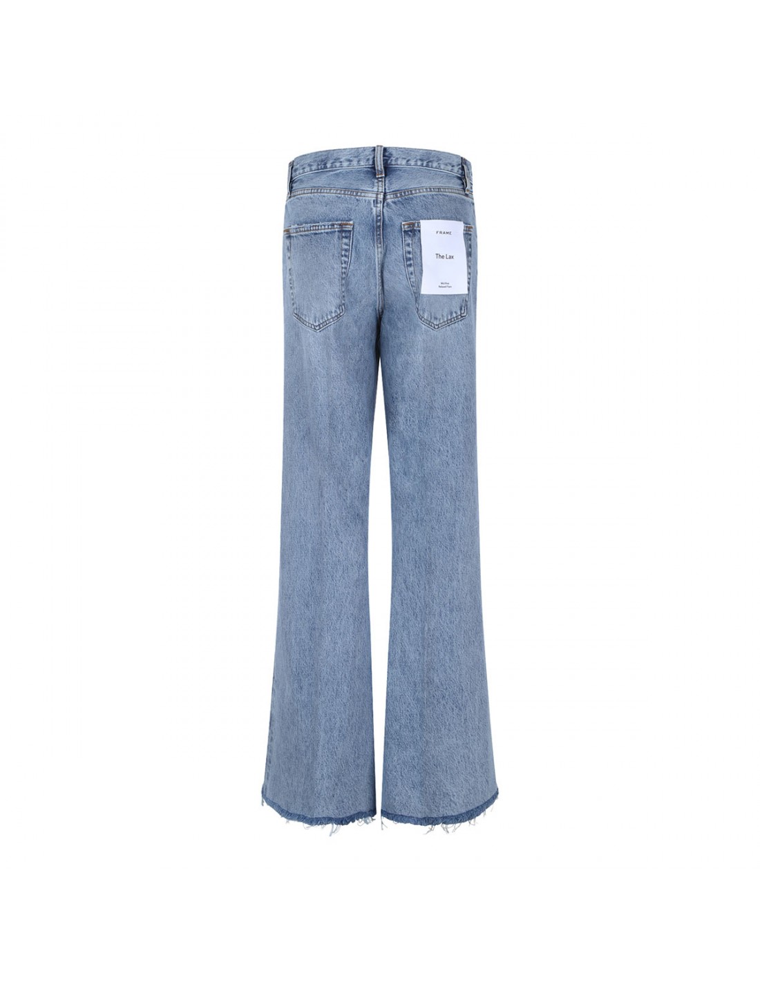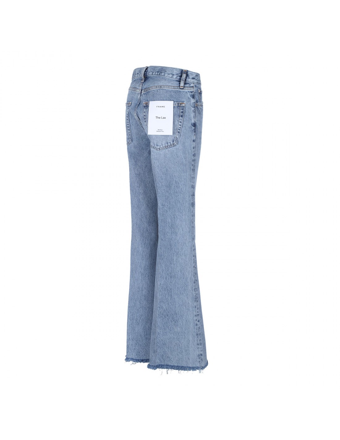 Light blue rigid denim The Lax jeans from Frame featuring fitted hips and wide flared legs, raw frayed hem, button closure, zip fly, classic five-pocket style, belt loops on the waistband.