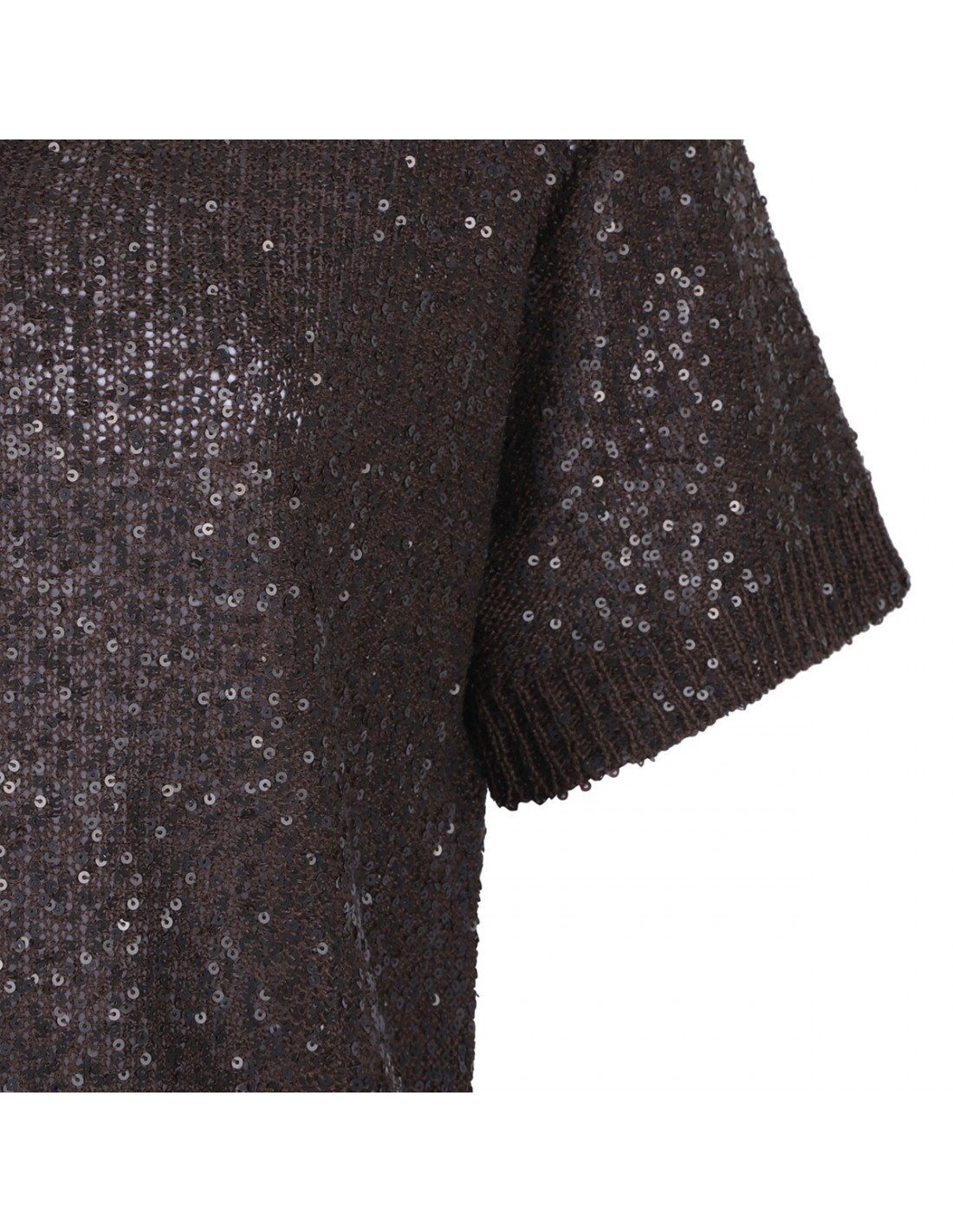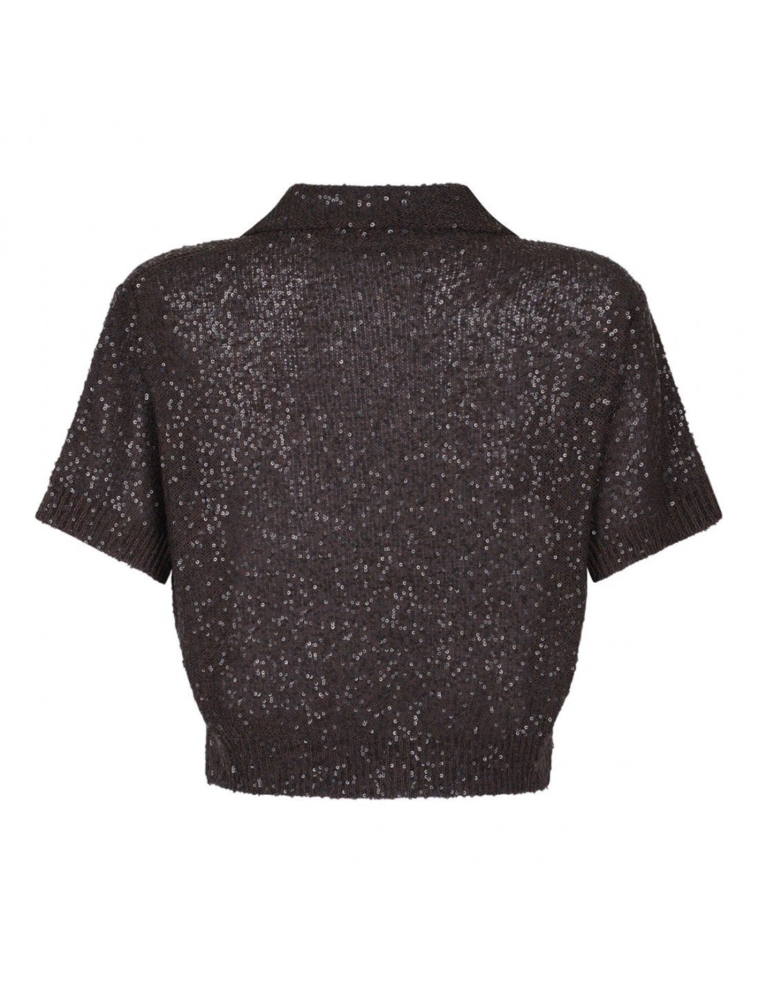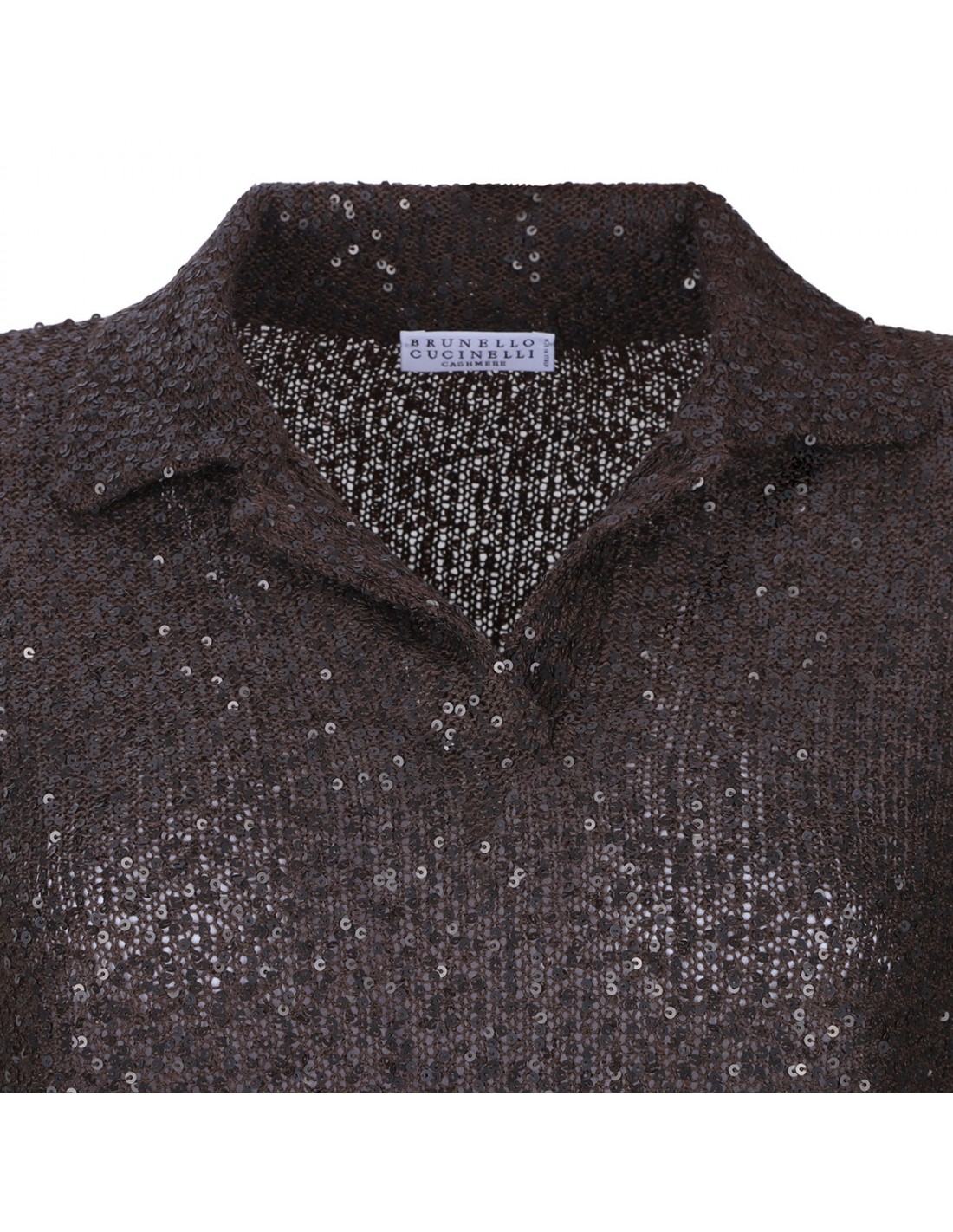 Chocolate hue knit linen, cashmere and silk polo shirt from Brunello Cucinelli featuring sparkling sequins embroidery, short sleeves, polo collar with V-neck, ribbed knit edges.