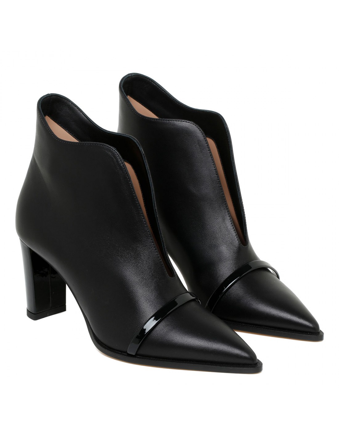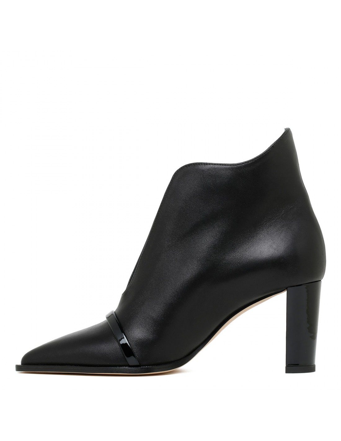 Black leather Clara Booties from Malone Souliers featuring deep V cut complements a pointed toe, signature single nappa strap on toe cap, pointed toe, 70 block heel, leather insole and sole.