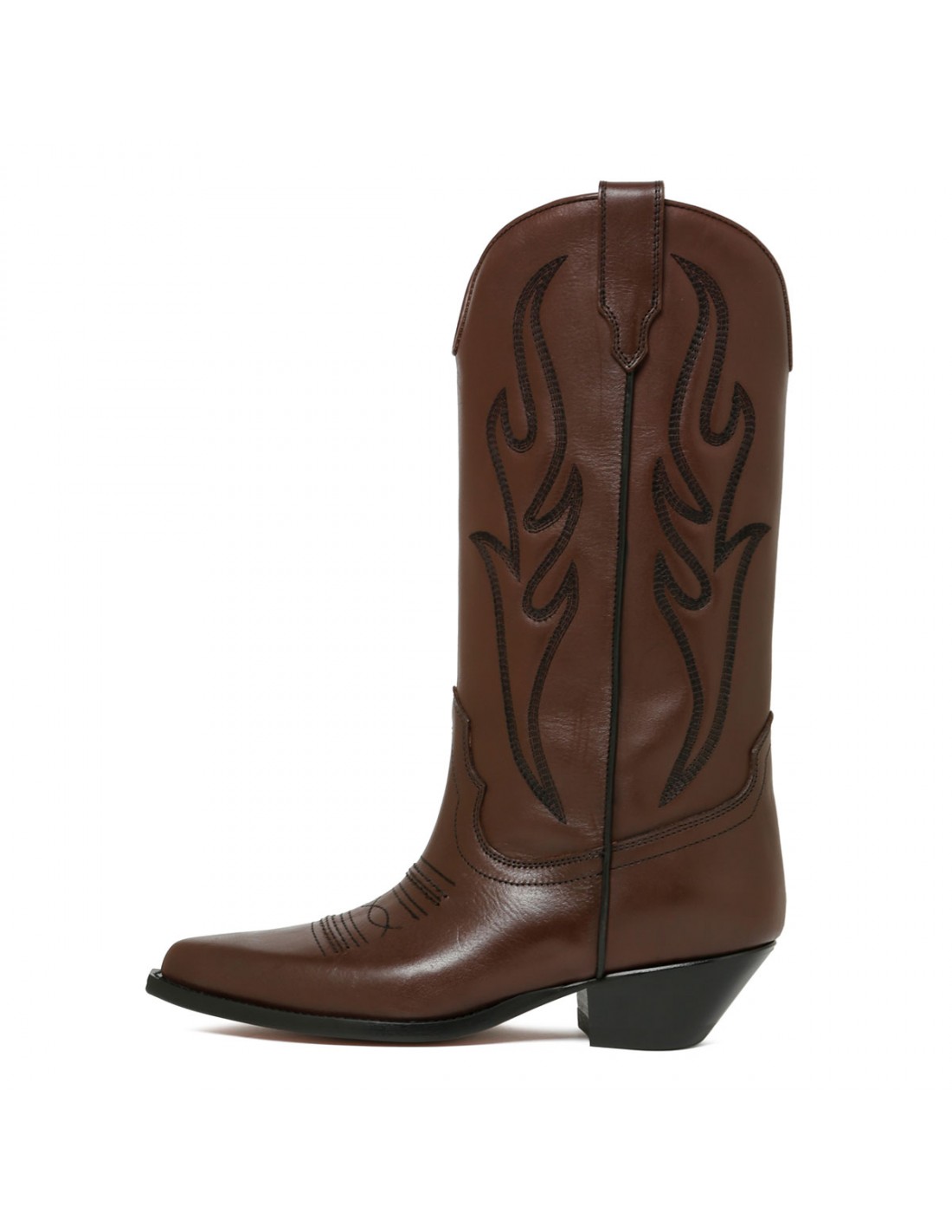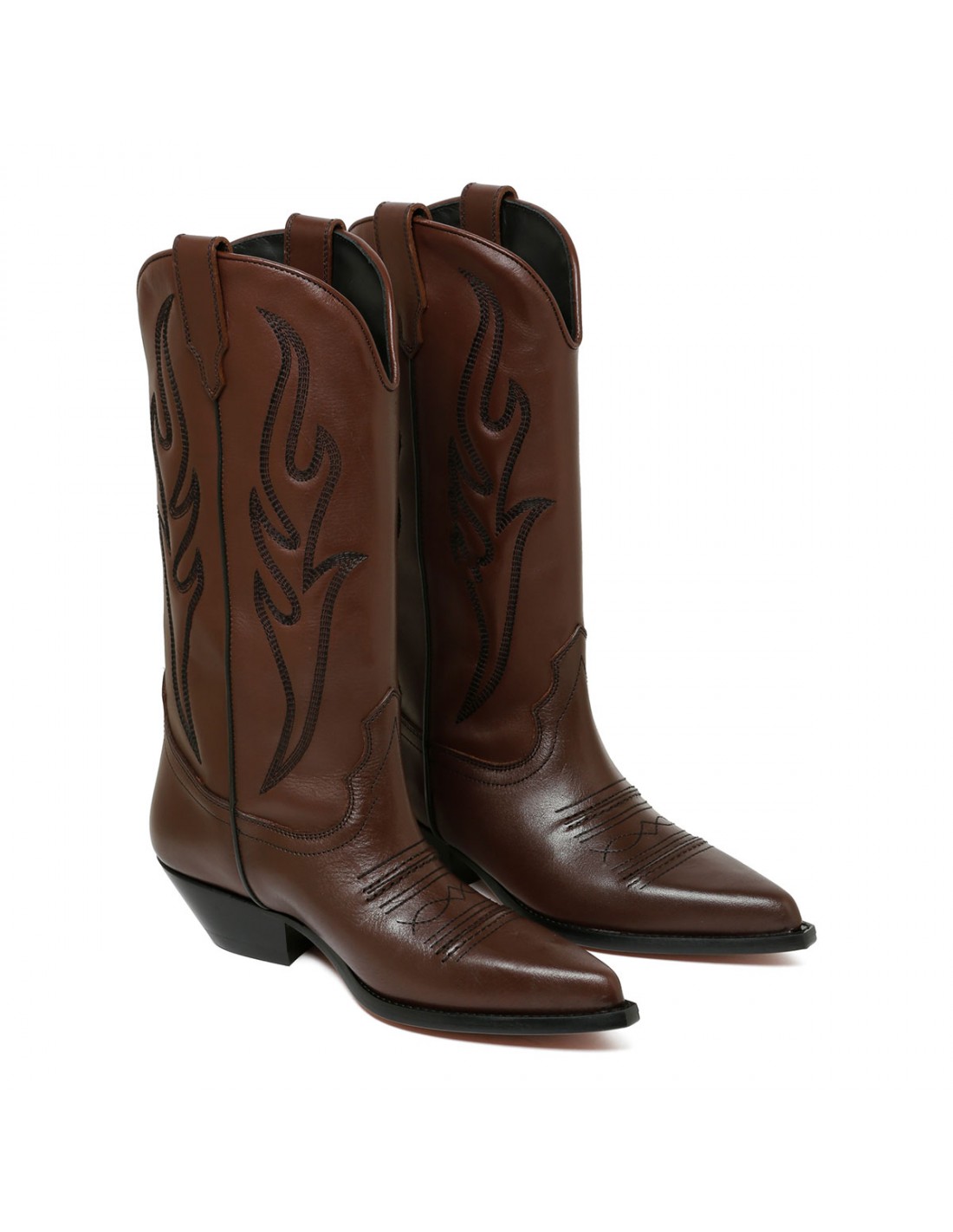 Brown leather Santa Fe boots from Sonora featuring Western-inspired silhouette, embroideries on the shaft and vamp, pointed toe, Cuban low heel, leather insole and sole.