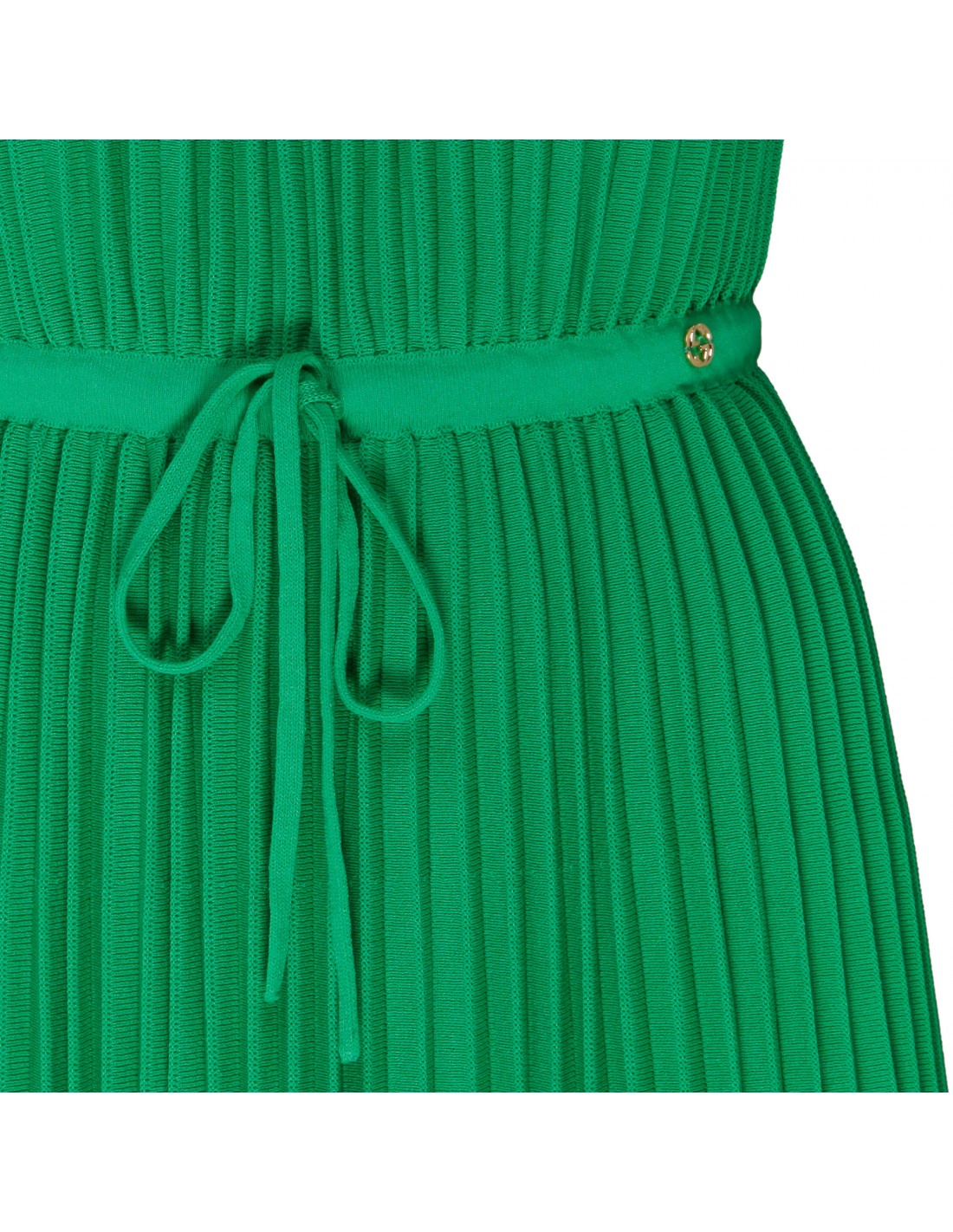 Green pleated viscose blend dress from Gucci featuring interlocking G metal detail, Gold lame striped trim, two shoulder straps, scoop neck, drawstring waist.