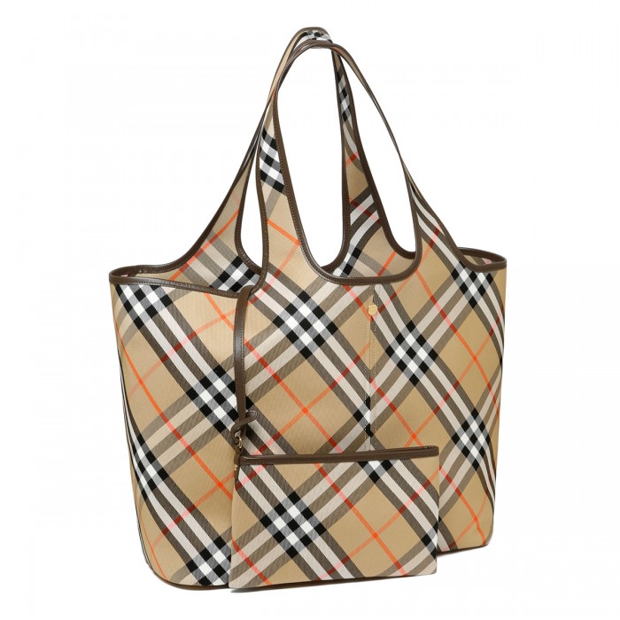 Beige, black, red and white cotton twill structured medium tote from Burberry featuring seasonal Burberry check, smooth calf leather trims, detachable zipped pouch, top handles, press-stud fastening, hand-painted edges.