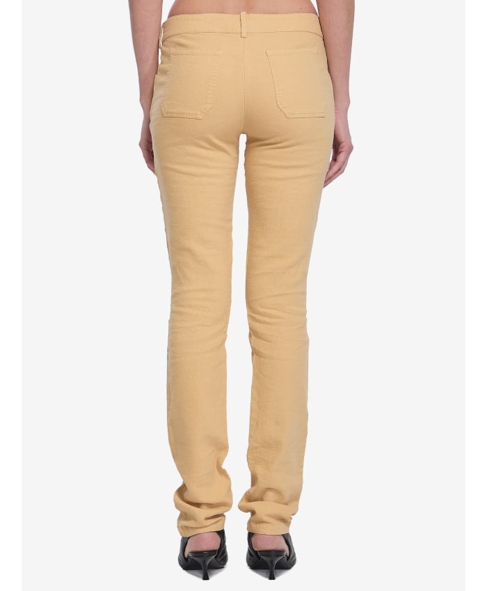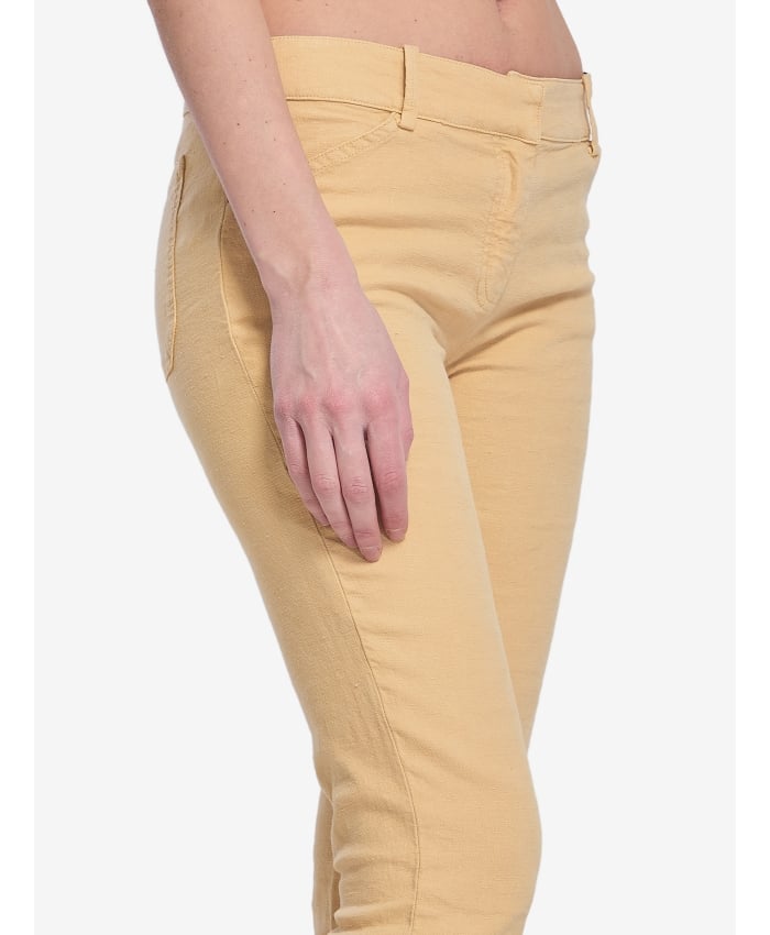 Low-rise trousers in yellow stretch linen. They feature a hook and zip closure, two side pockets, belt loops, two back pockets, and slim legs. Any