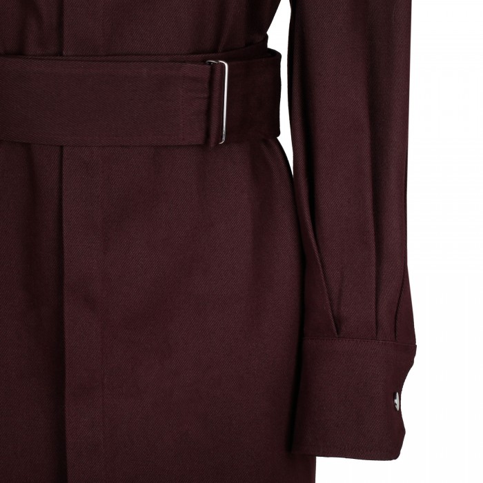 Dark red cotton Valentina jacket from Sa Su Phi featuring concealed button closure, dropped shoulder, adjustable and detachable belt with buckle at waist, long sleeves with buttoned cuffs and pointed collar.