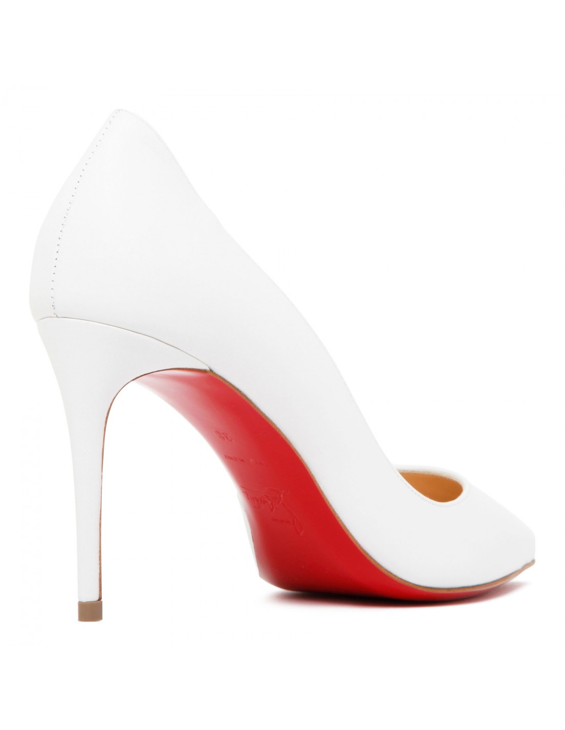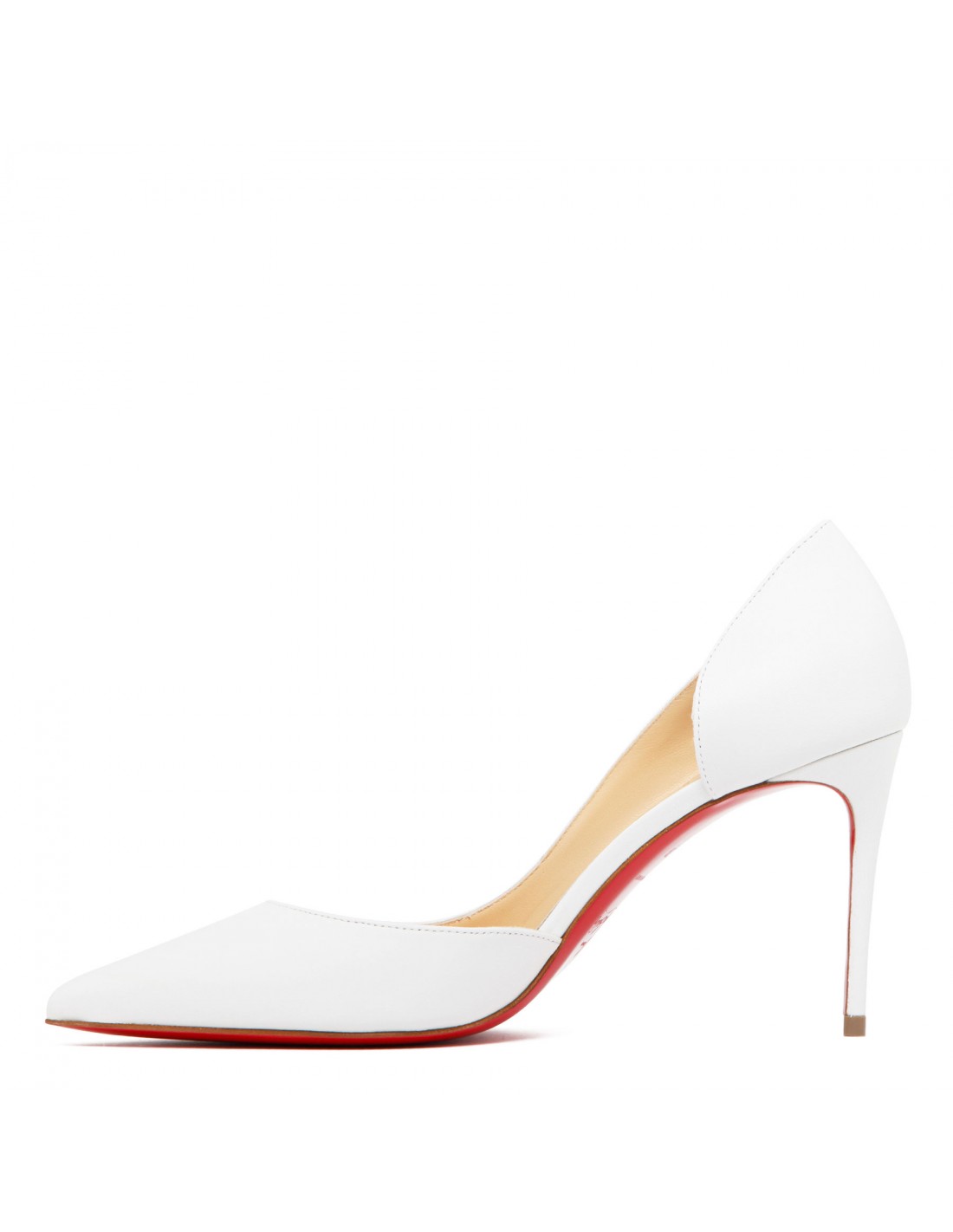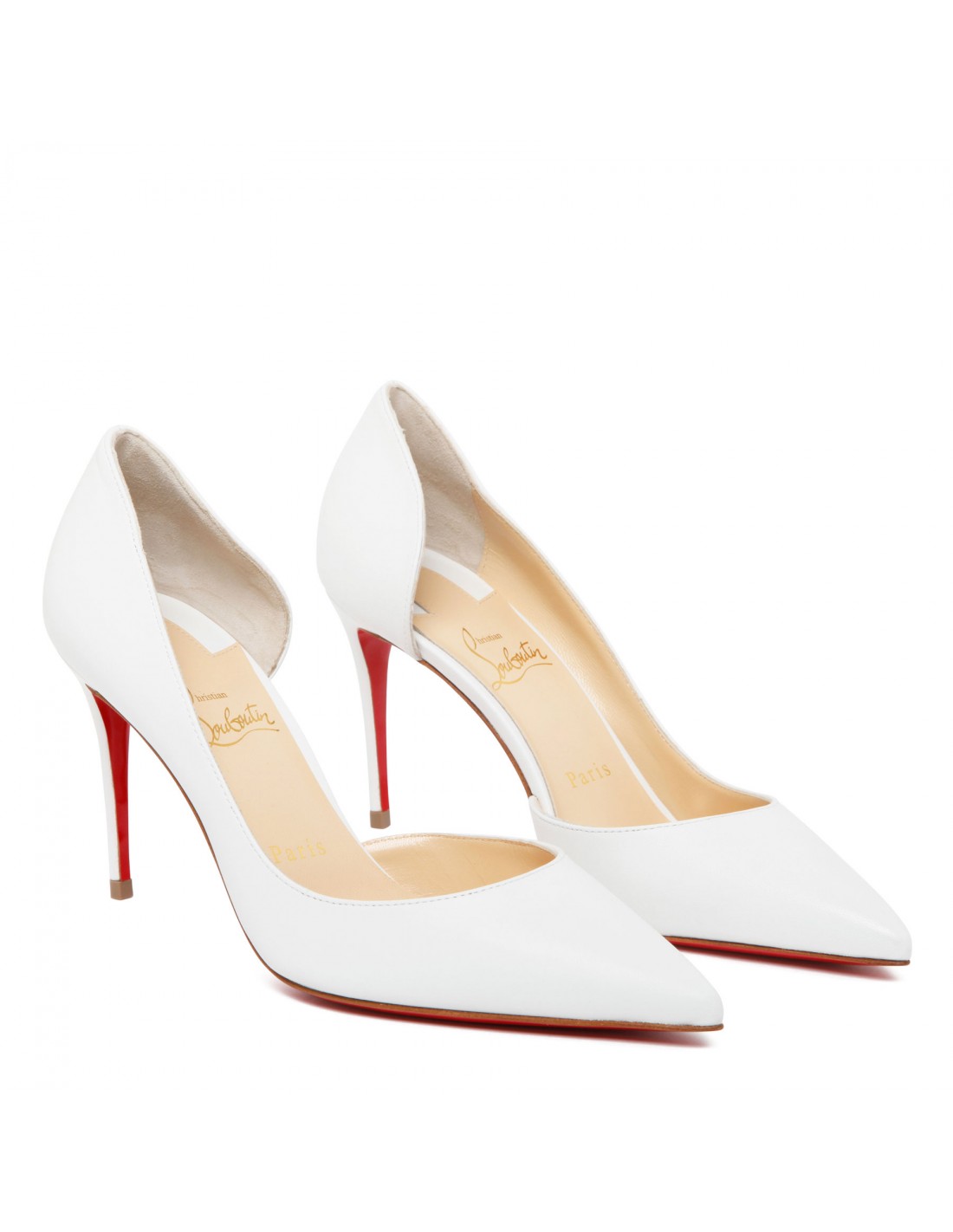 White nappa leather Iriza pumps from Christian Louboutin featuring half d'Orsay vamp, pointed toe, leather covered 85 stiletto heel, leather insole, signature red leather outsole.