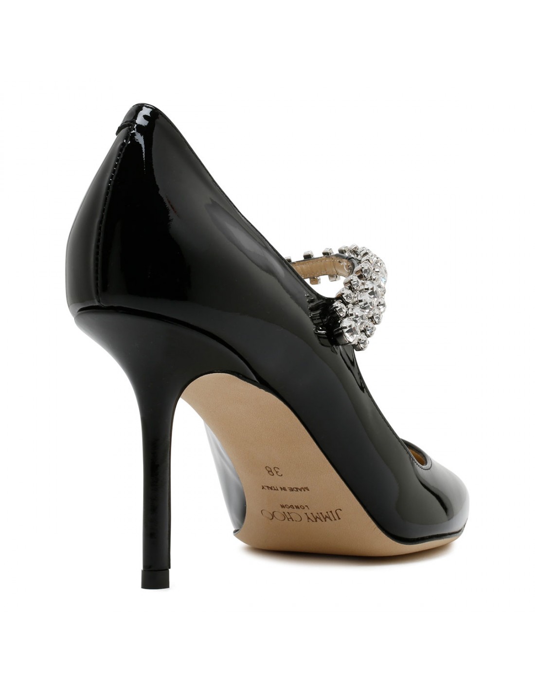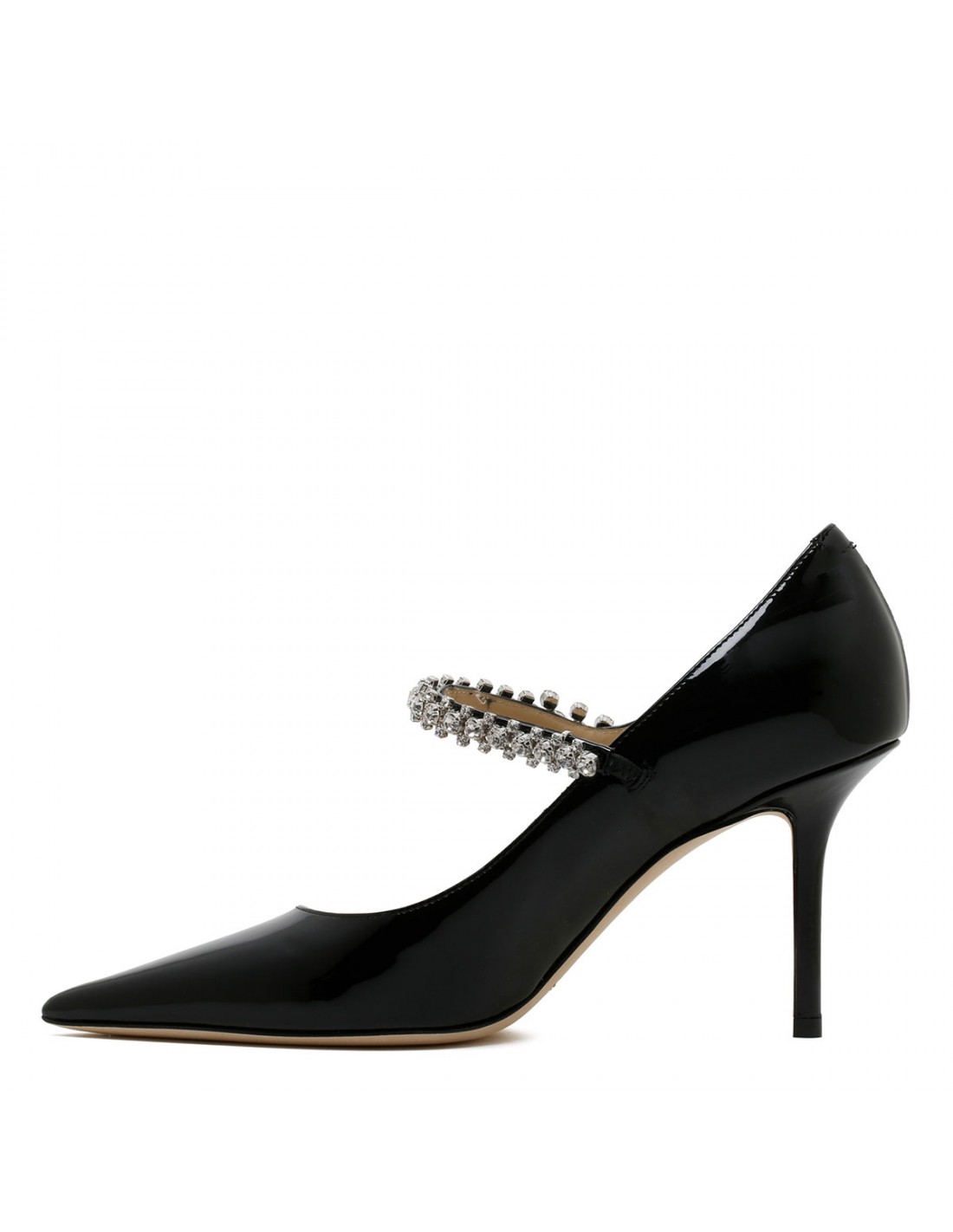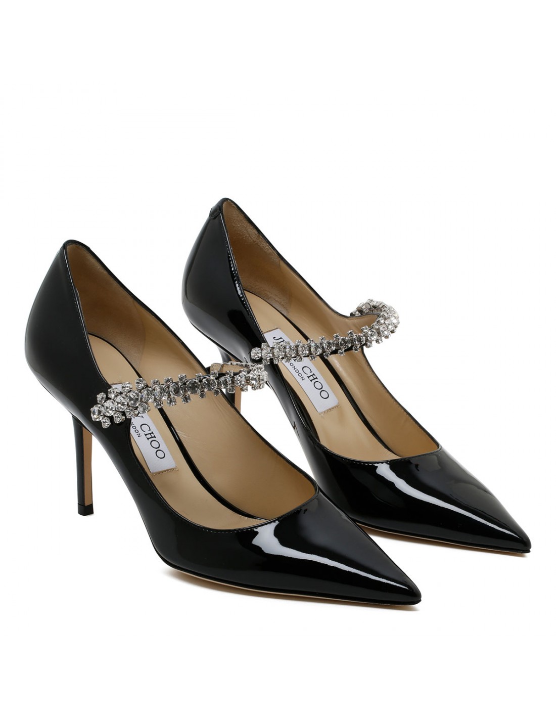 Black patent leather Bing pumps from Jimmy Choo featuring hand-finished crystal strap, pointed toe, 85 slim heel, leather lining and sole, slip on style.