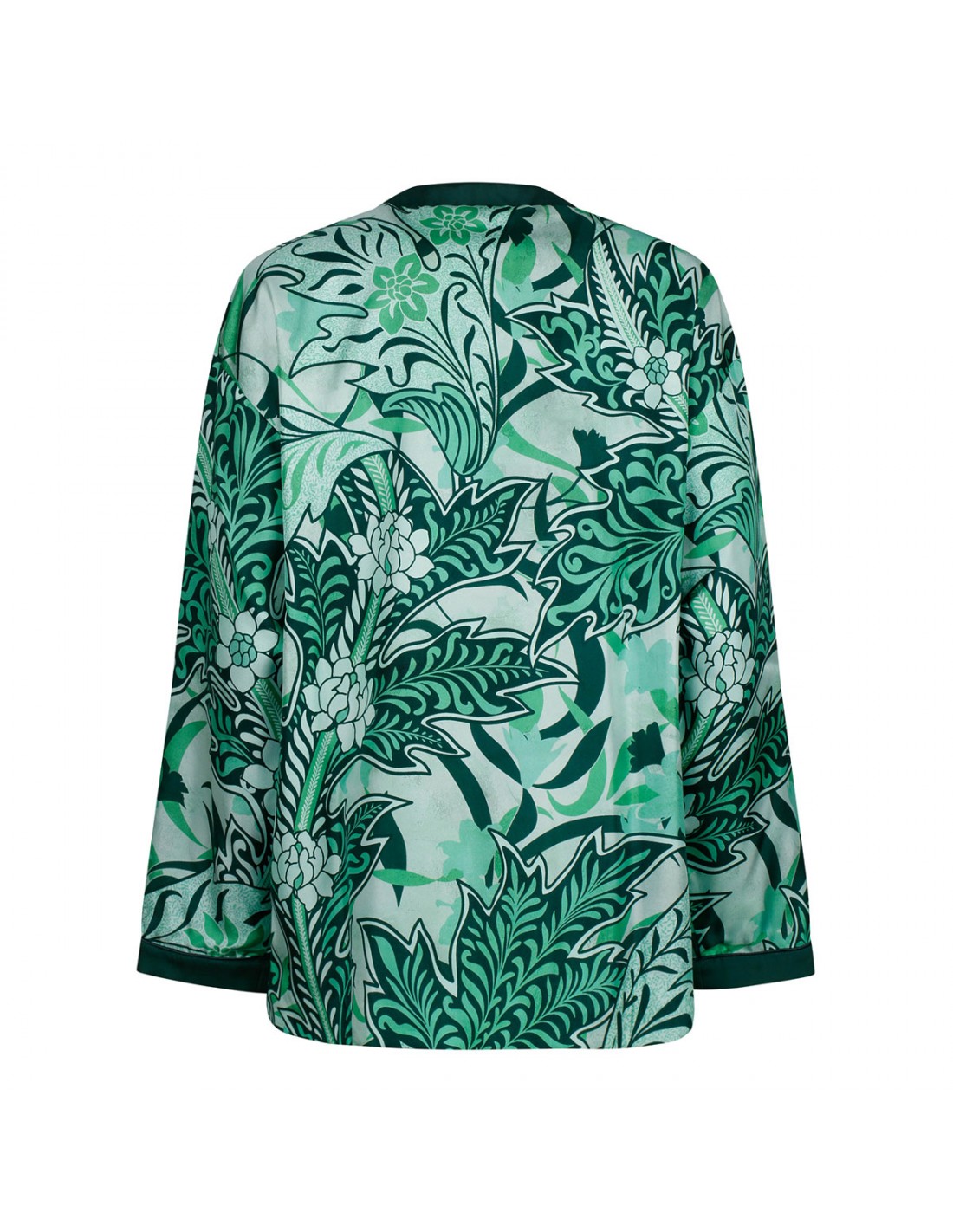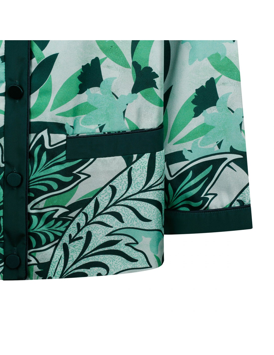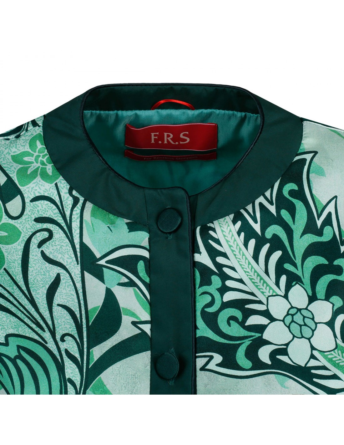 Green silk twill Ligea shirt-jacket from FRS featuring flower and leaf motif print, corean collar, tonal green trims, applied pockets on the front, long sleeves.