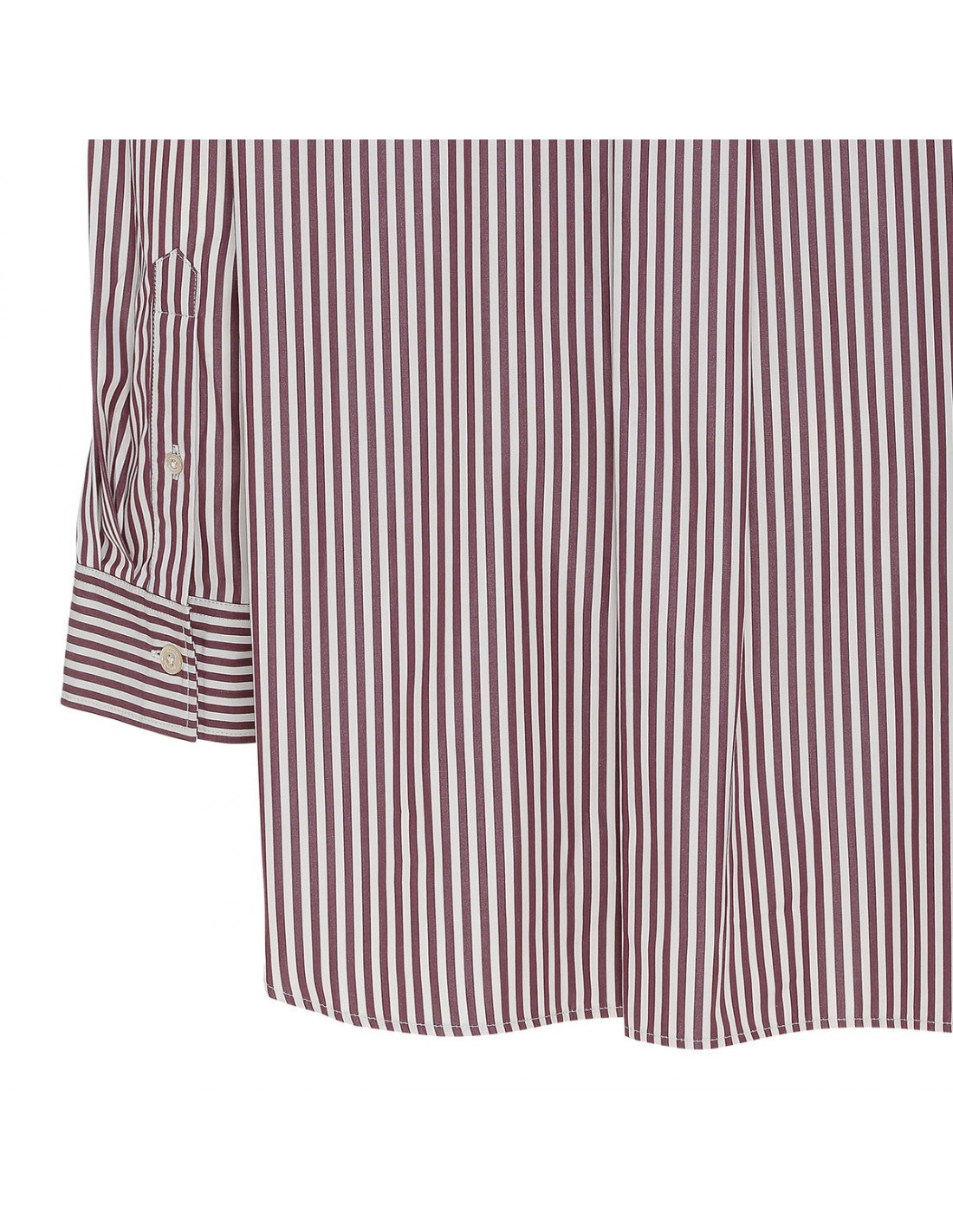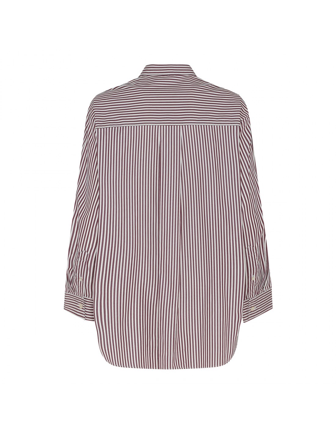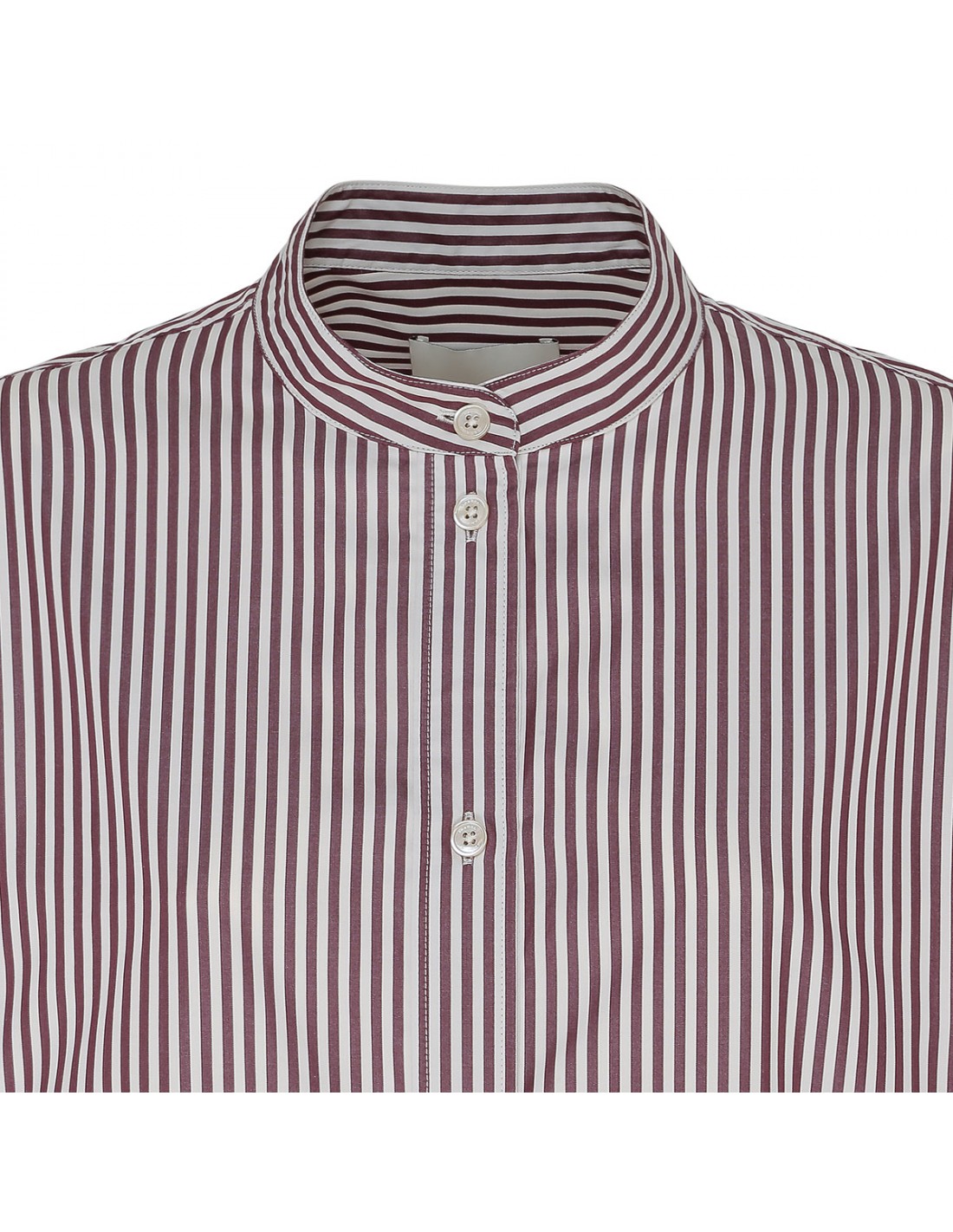 Ecru and burgundy cotton poplin Faby shirt from Marant Etoile featuring striped motif allover, mandarin collar, long sleeves with buttoned cuffs, button fastening at front, back box pleats.