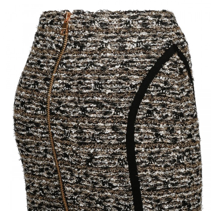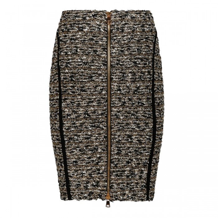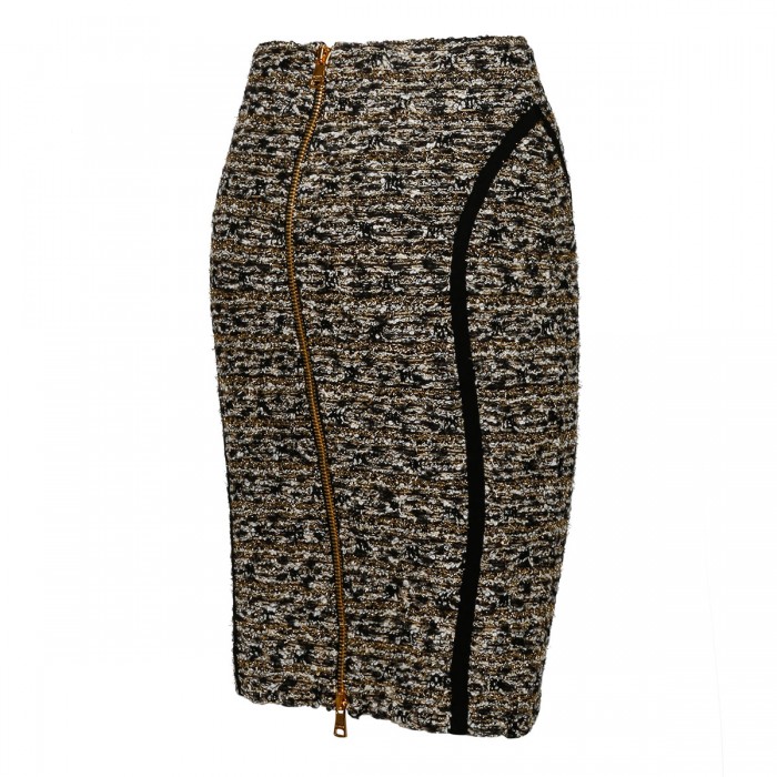 Gold lurex tweed skirt from Balmain featuring fitted silhouette, high waist, knee-length, contrasting detail and gold metal double zip fastening at back.