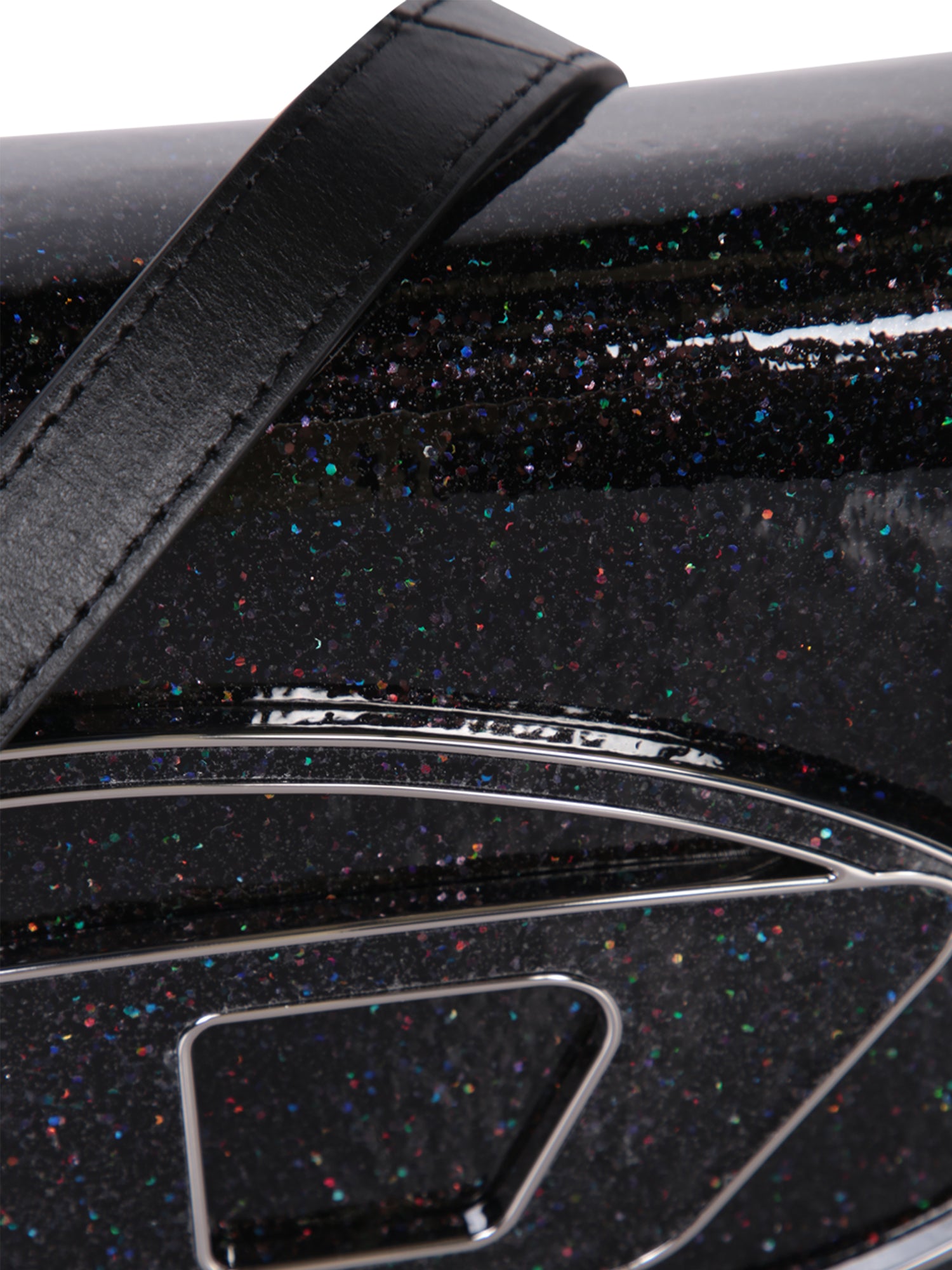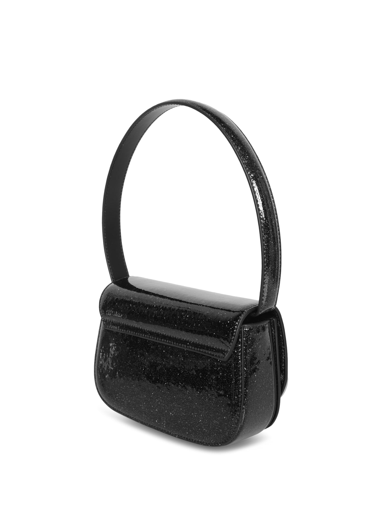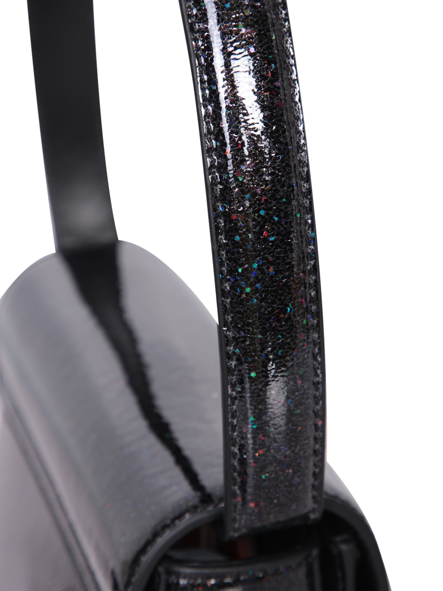 Glitter-effect faux leather shoulder bag. Flap closure with magnetic button. Features an adjustable strap.