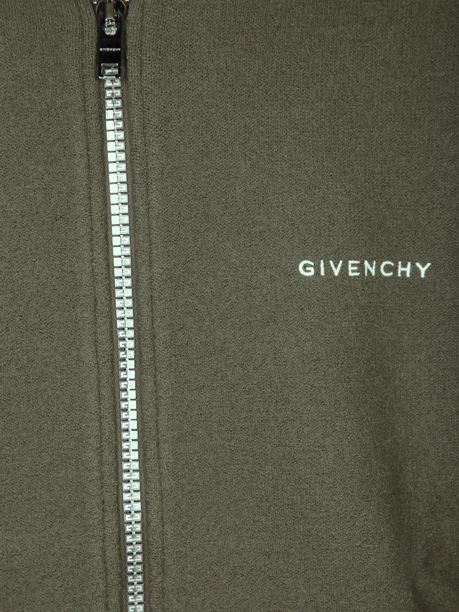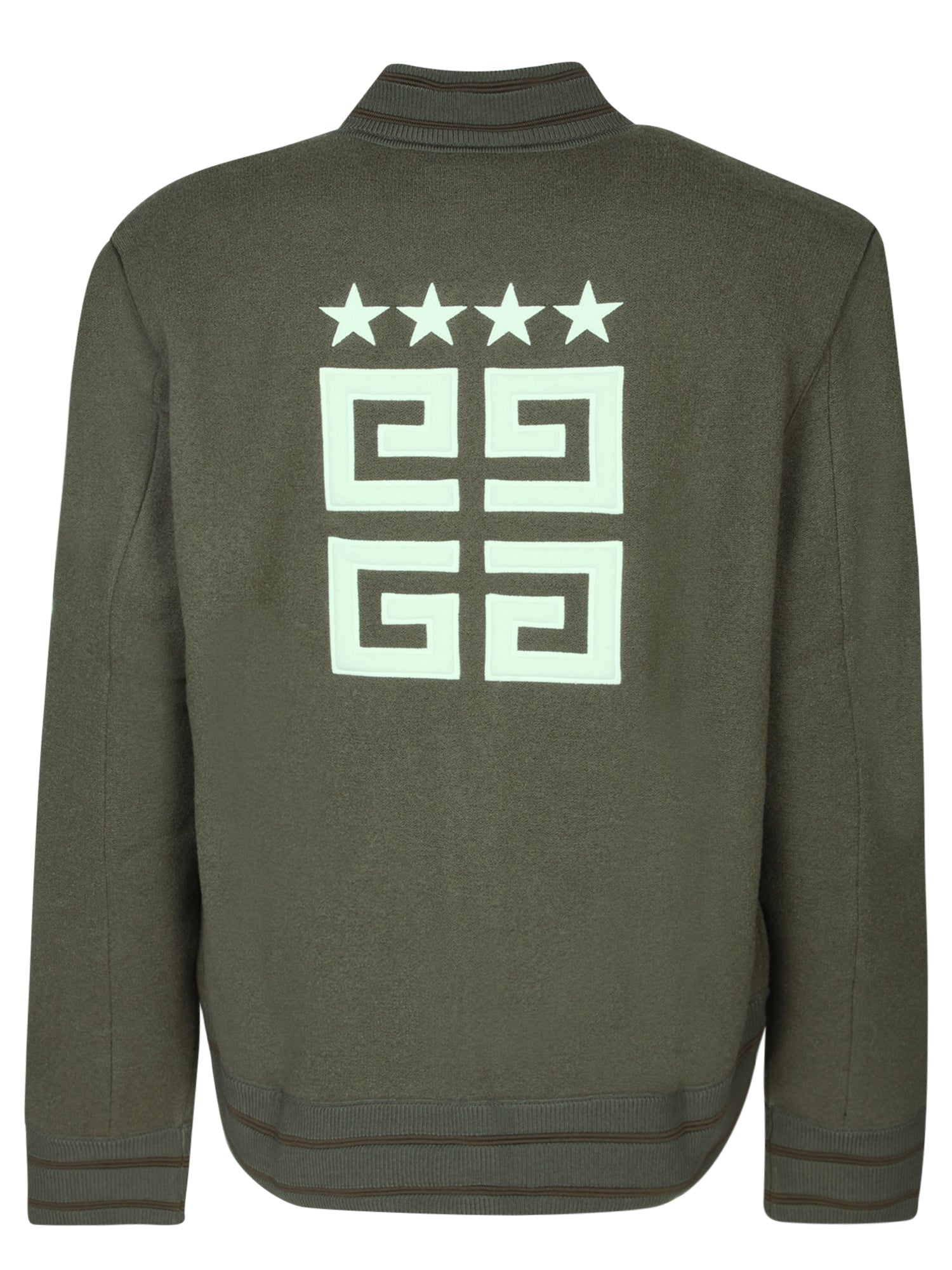 Front zip-up jacket with raised collar and side welt pockets. Rib-knit trims.