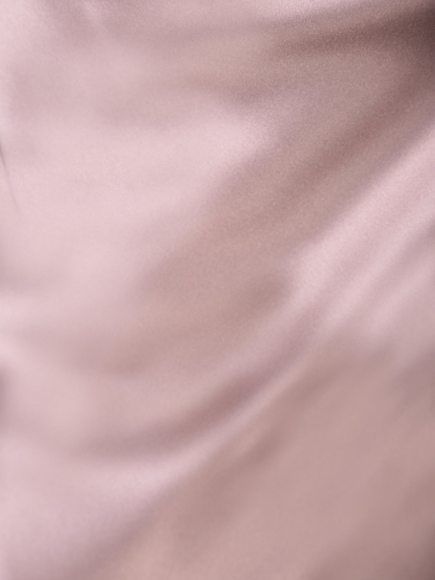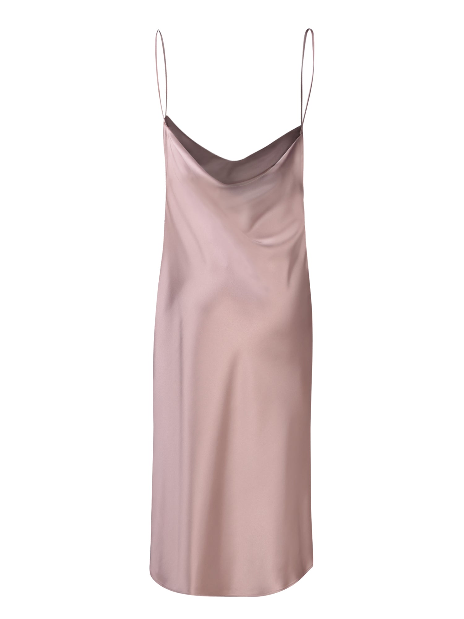 Blanca Vita signature midi dress Acanthus in stretch satin in taupe hue with thin straps and asymmetrical draped neckline