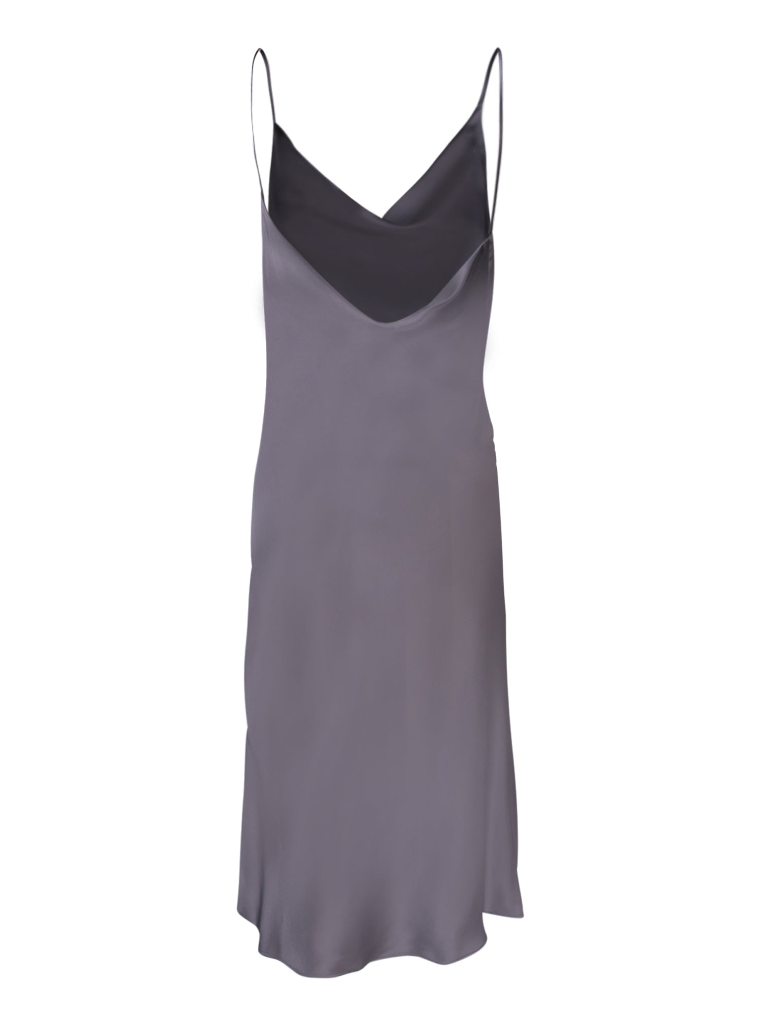 Blanca Vita signature midi dress Acanthus in stretch satin in taupe hue with thin straps and asymmetrical draped neckline