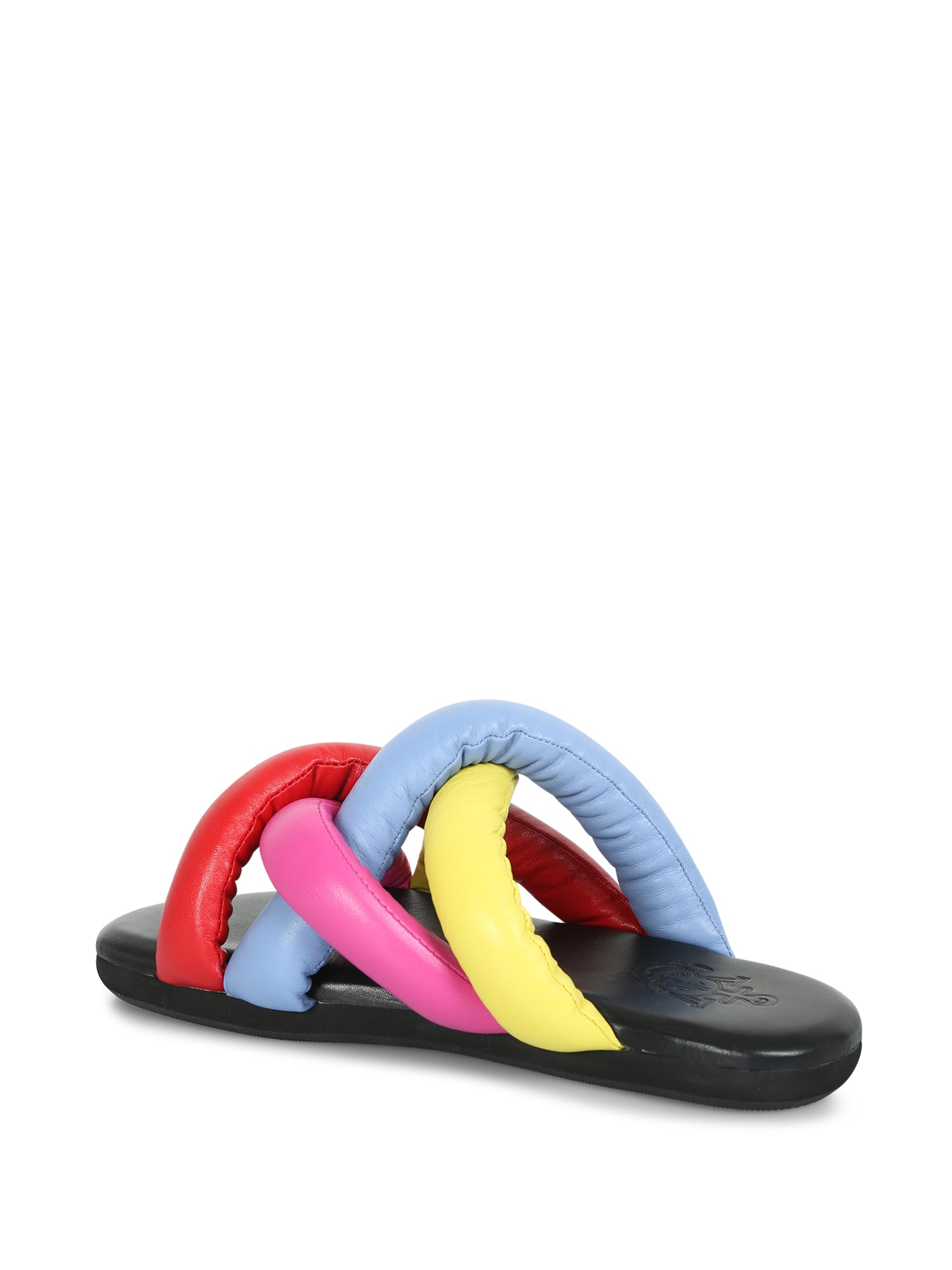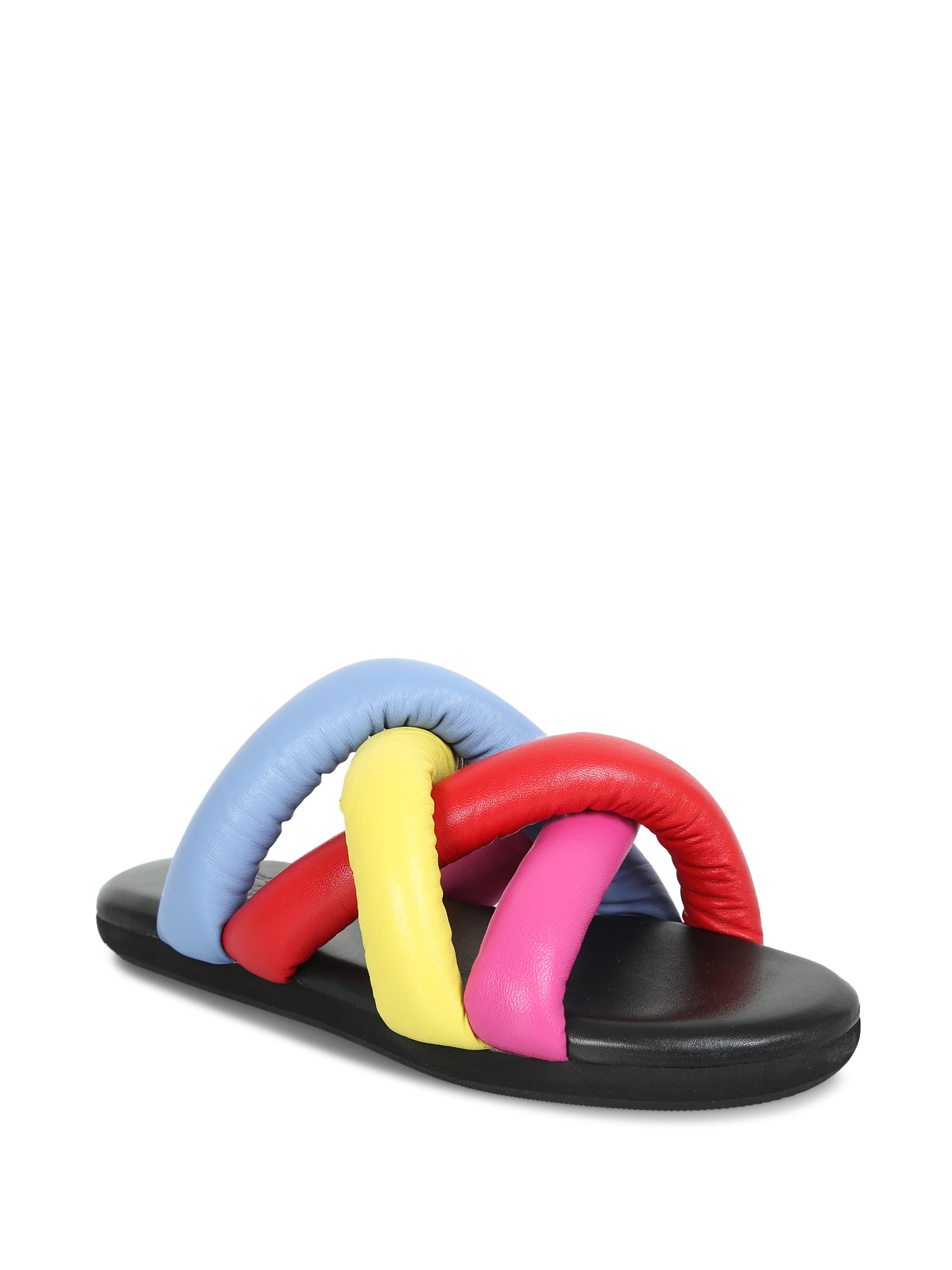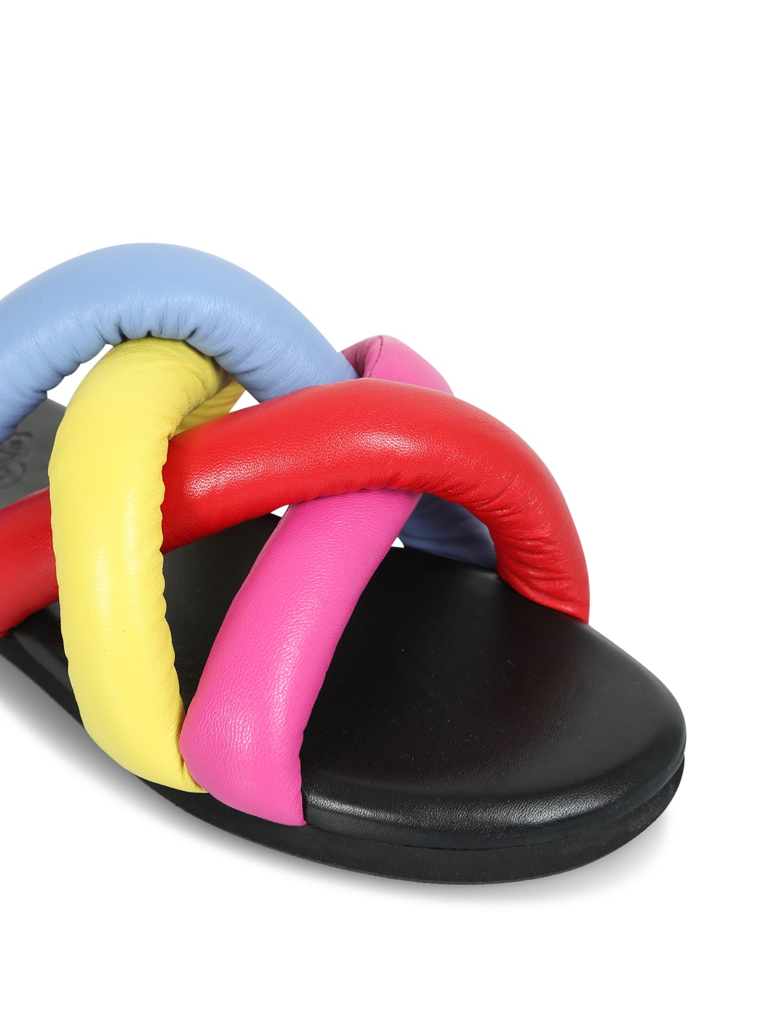 A statement shoe for women, the Jbraided nappa leather sliders from the 1 Moncler JW Anderson collection add a touch of whimsy to looks.