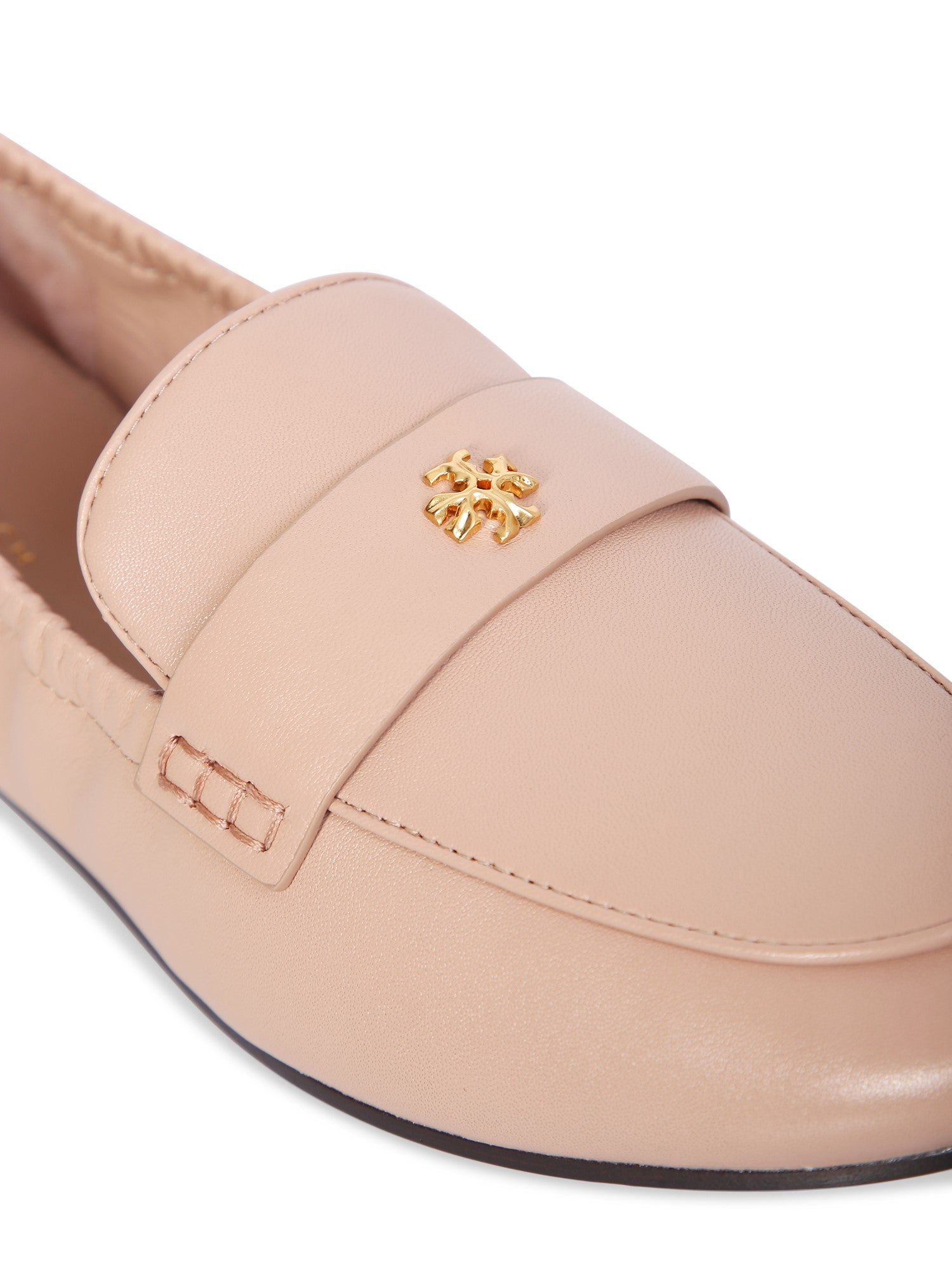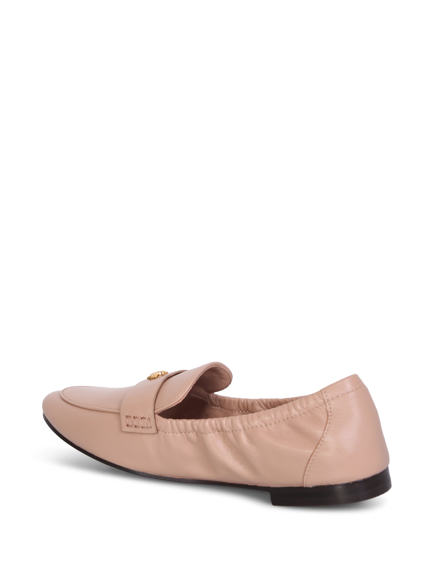 Tory Burch loafers, minimalist blush-pink design embellished with gold logo charms on the uppers