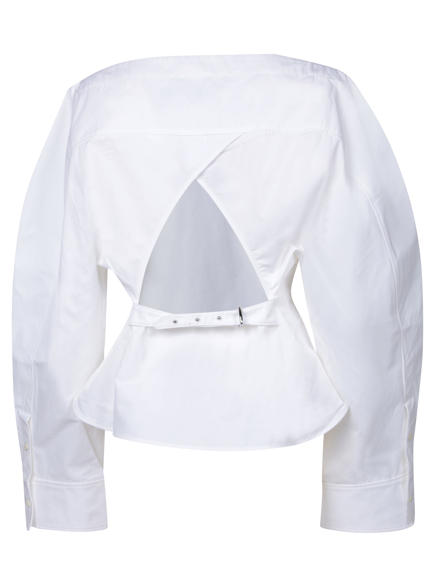 Three-quarter sleeves with finished cuffs. Cropped design with structured front panel. Square neckline.