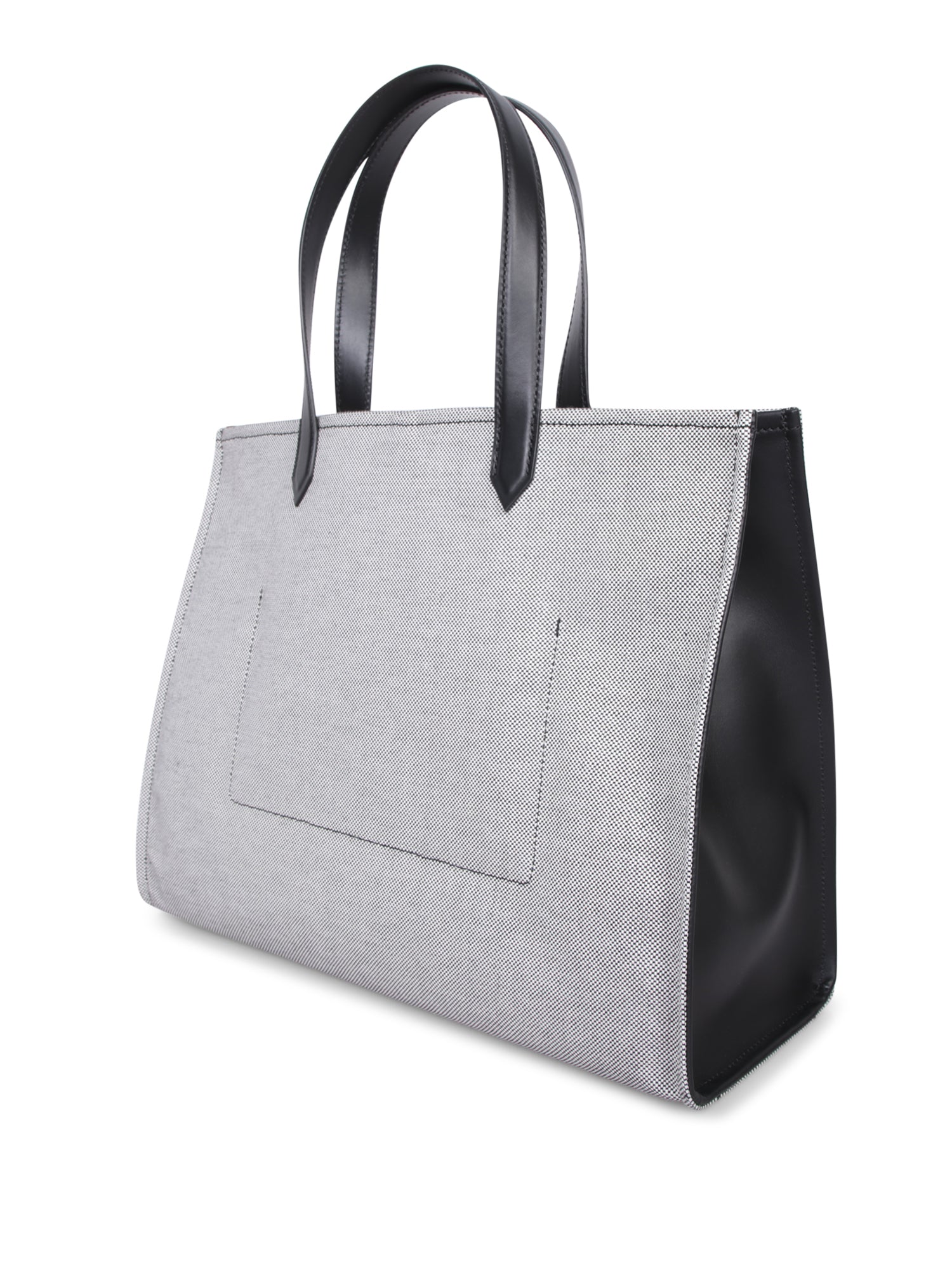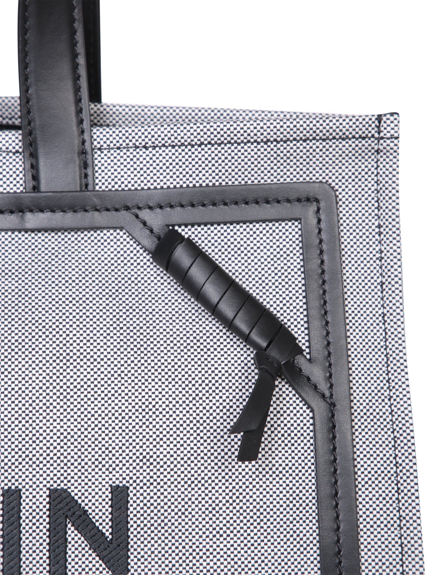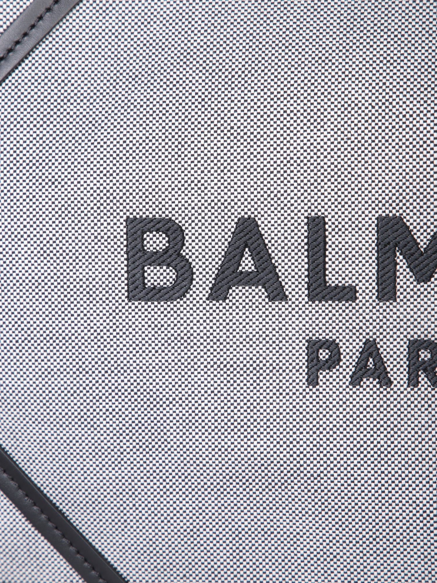 Cotton canvas bag with black leather details. Balmain PARIS logo printed in black on a white background.