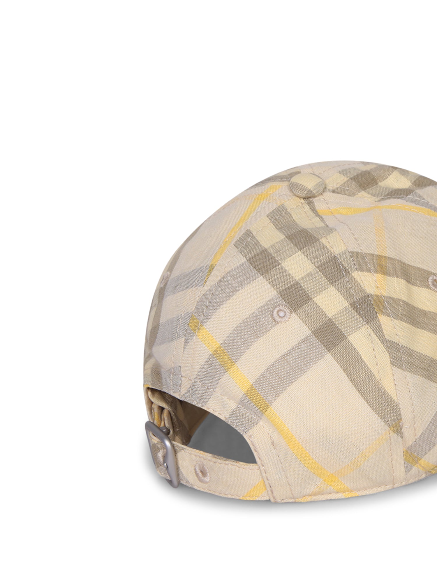 Baseball cap in linen with check pattern. Solid-color under visor. Back adjustment with buckle.