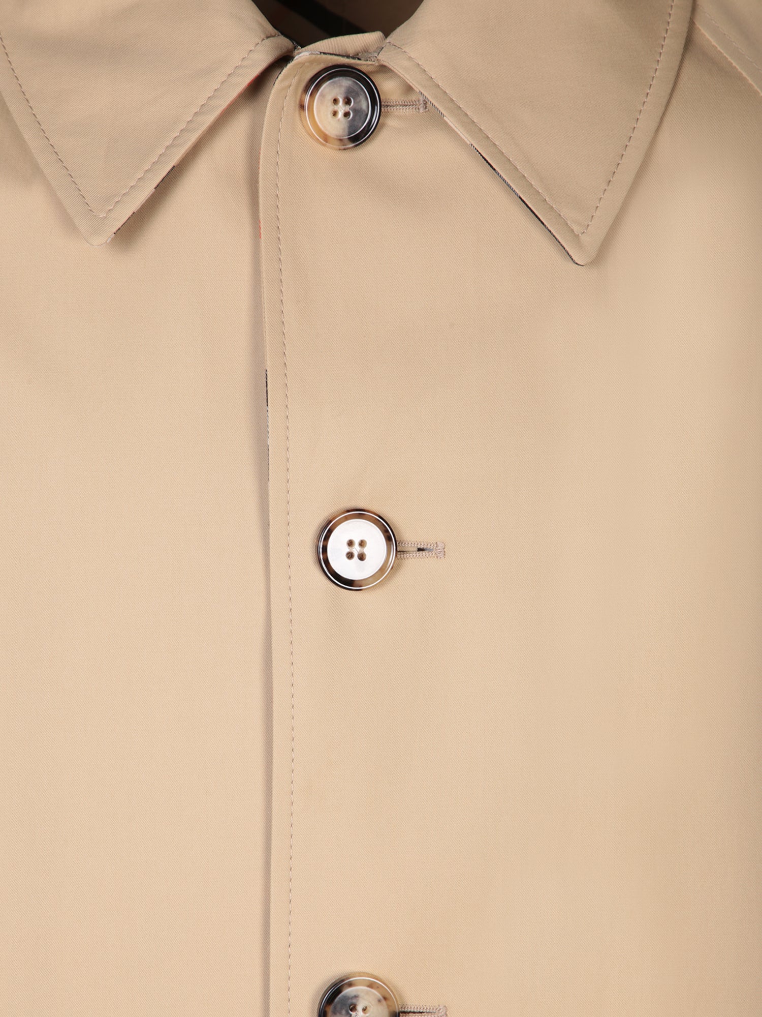 Premium fabric coat with button closure, classic collar, and checkered inner lining.