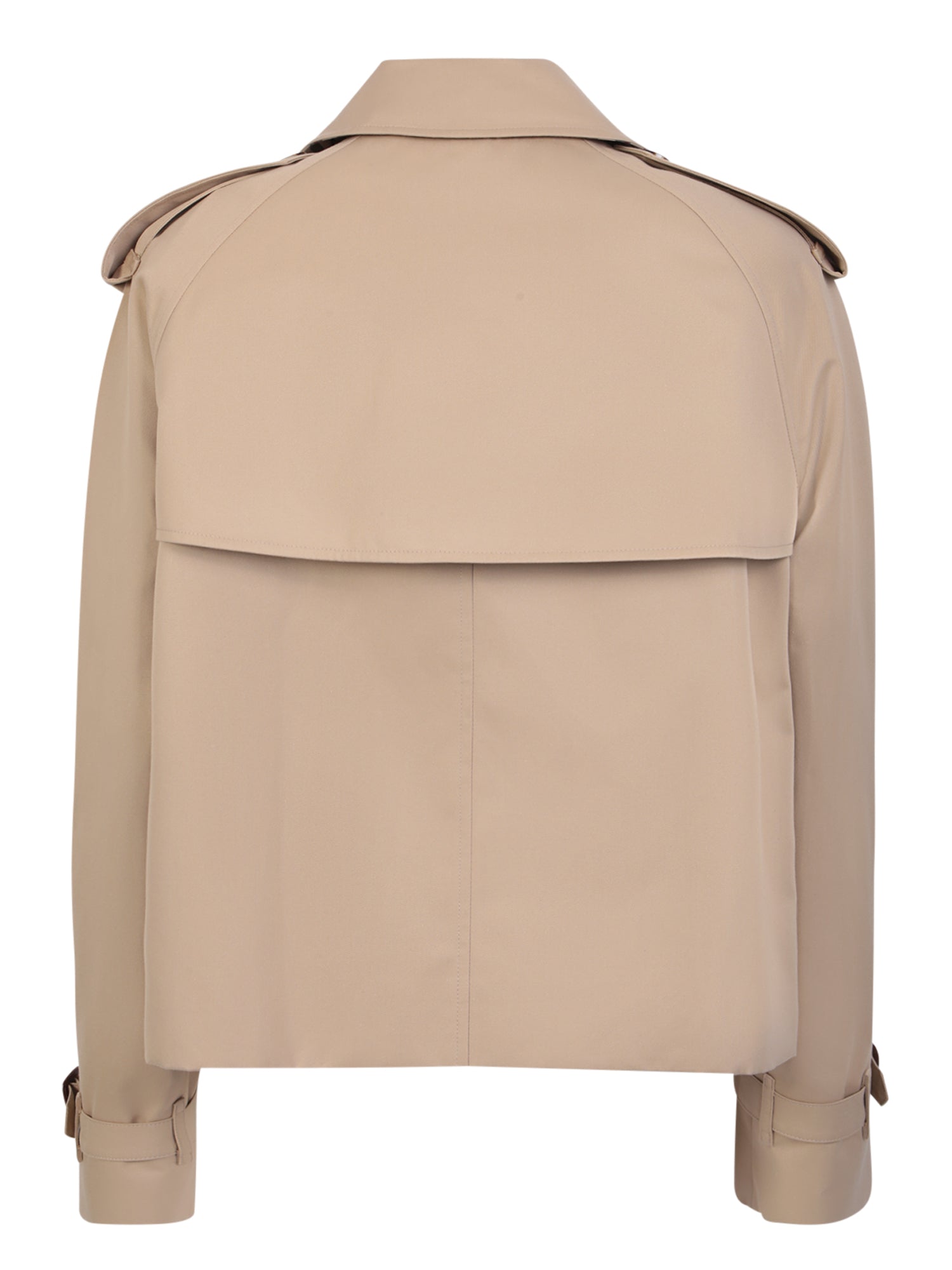 Beige crop trench coat by Burberry; each piece is steeped in heritage, where the brand's archive and iconic motif is celebrated
