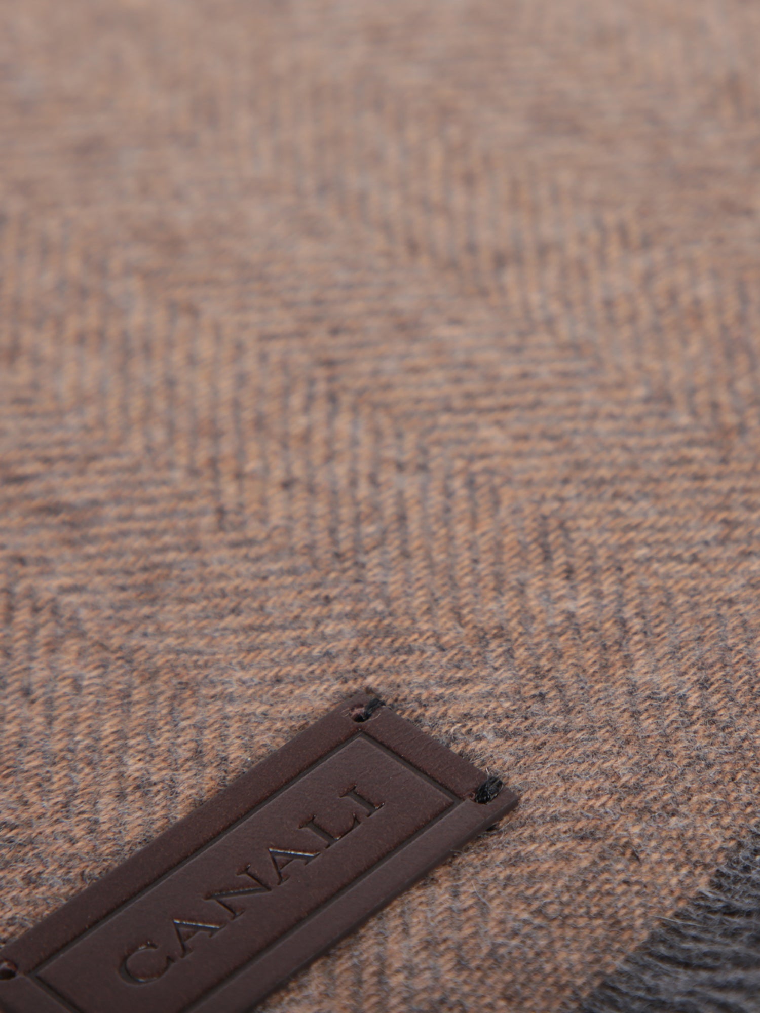 Herringbone fabric scarf with thin fringes at the edges. Features a branded logo label.