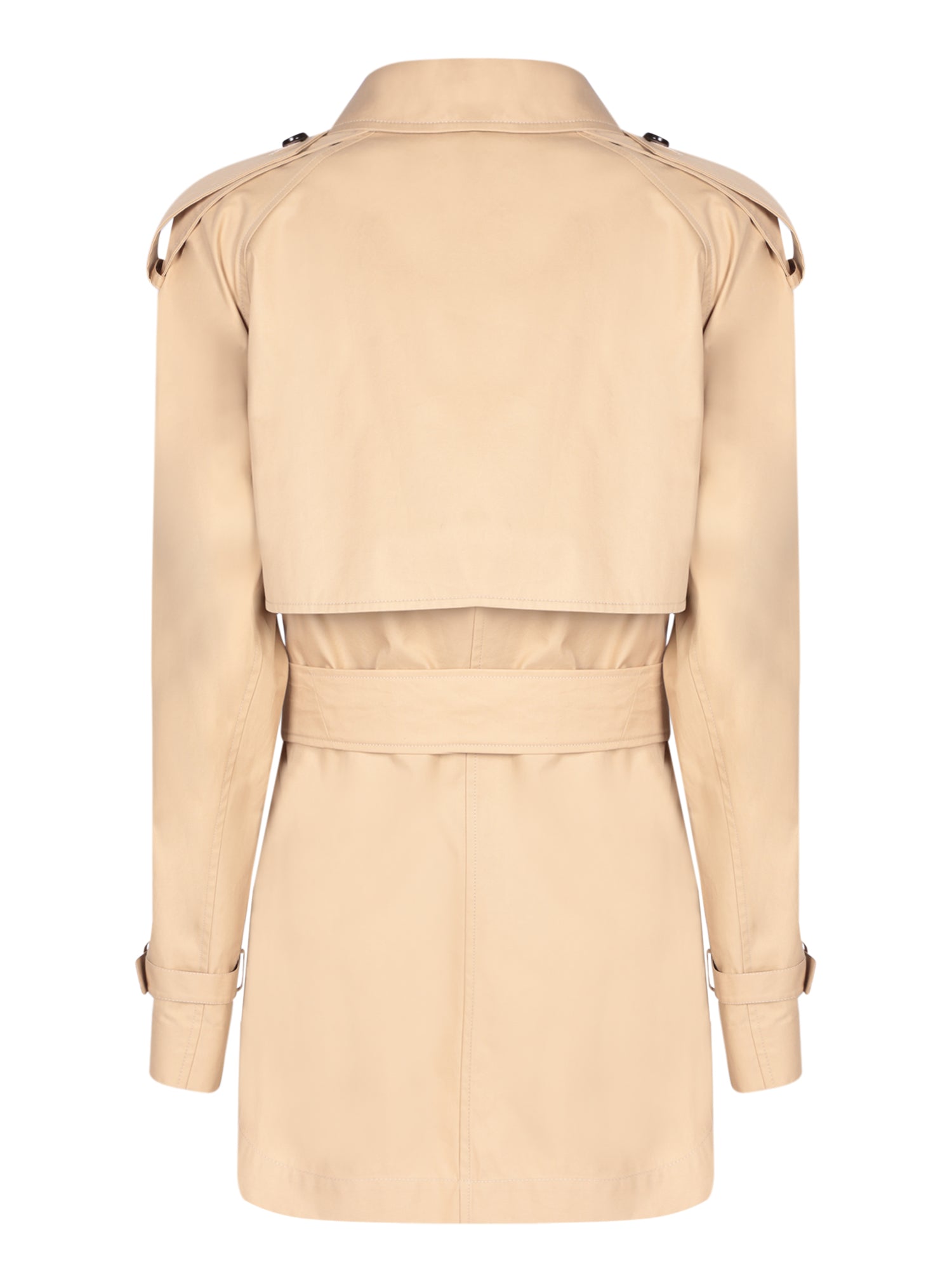 Short trench coat with double-breasted closure, adjustable belt, and buckle-adjustable cuffs. Flap pockets.
