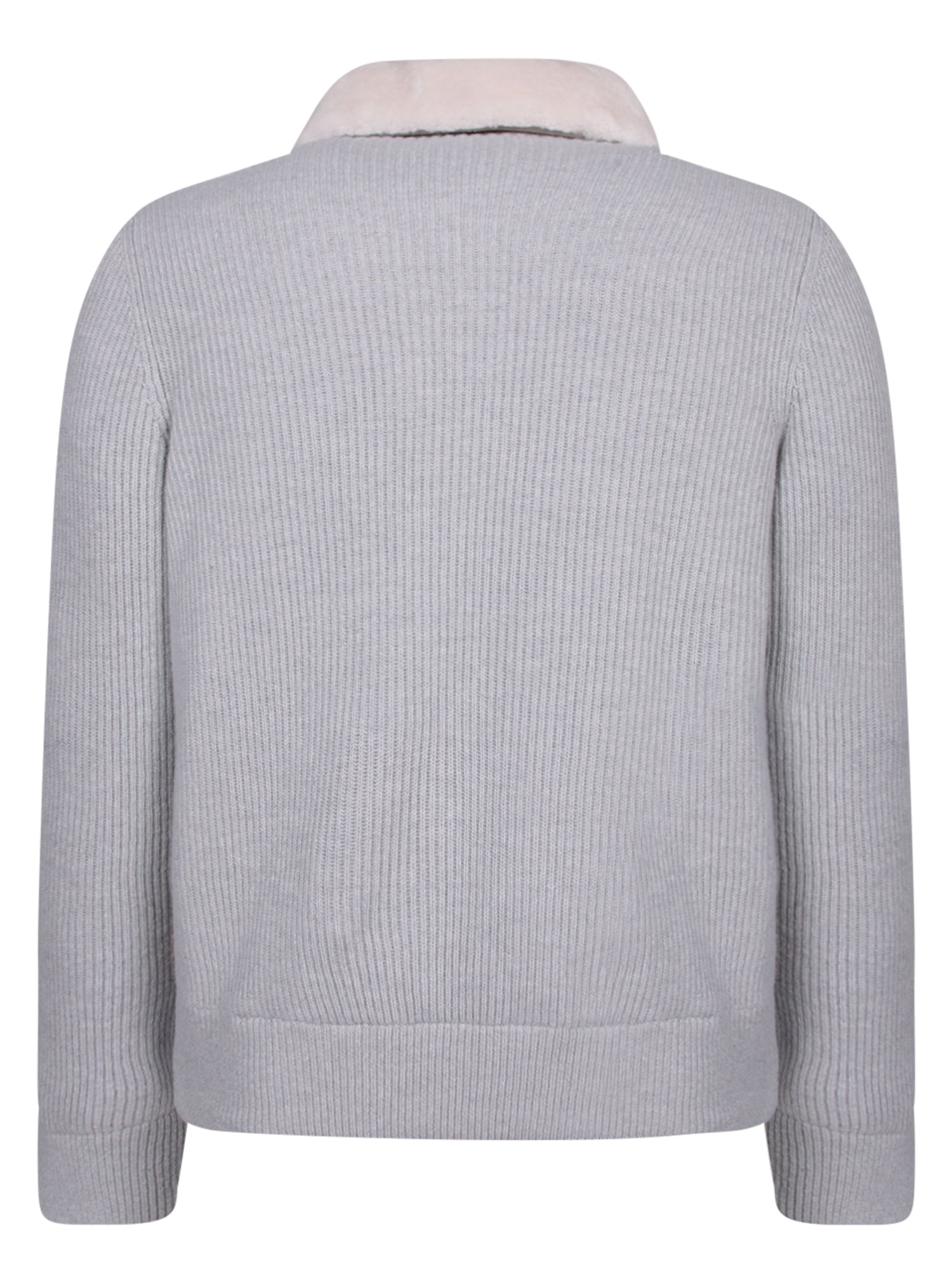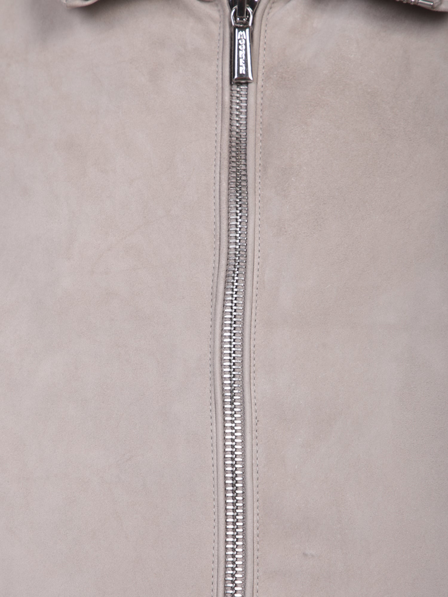 Suede jacket with synthetic fur collar, central zip closure, side zip pockets.