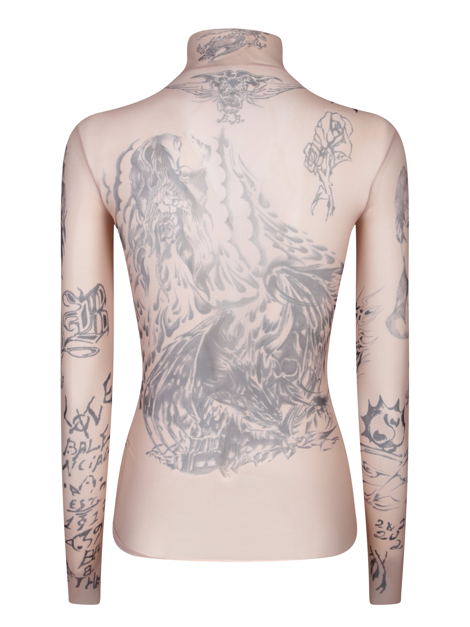 Long sleeve t-shirt. Crew neck. Full-body tattoo print design.