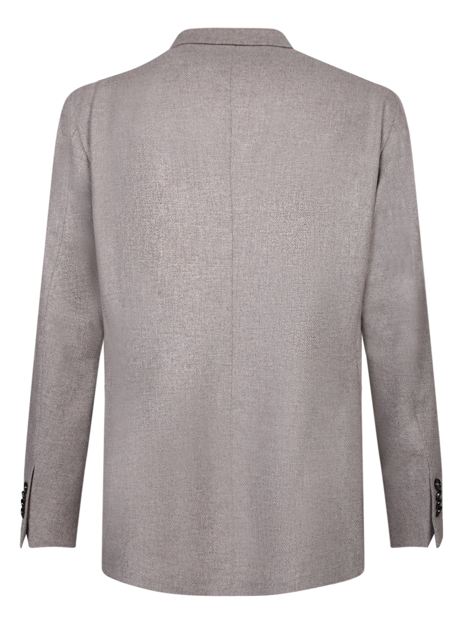 Double-breasted with contrasting buttons, peak lapels, flap pockets.