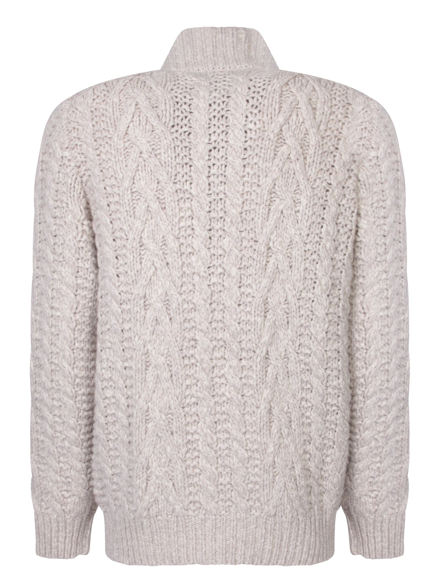 Wool cardigan featuring cable knit, high collar, and zip closure. Ribbed cuffs and hem.