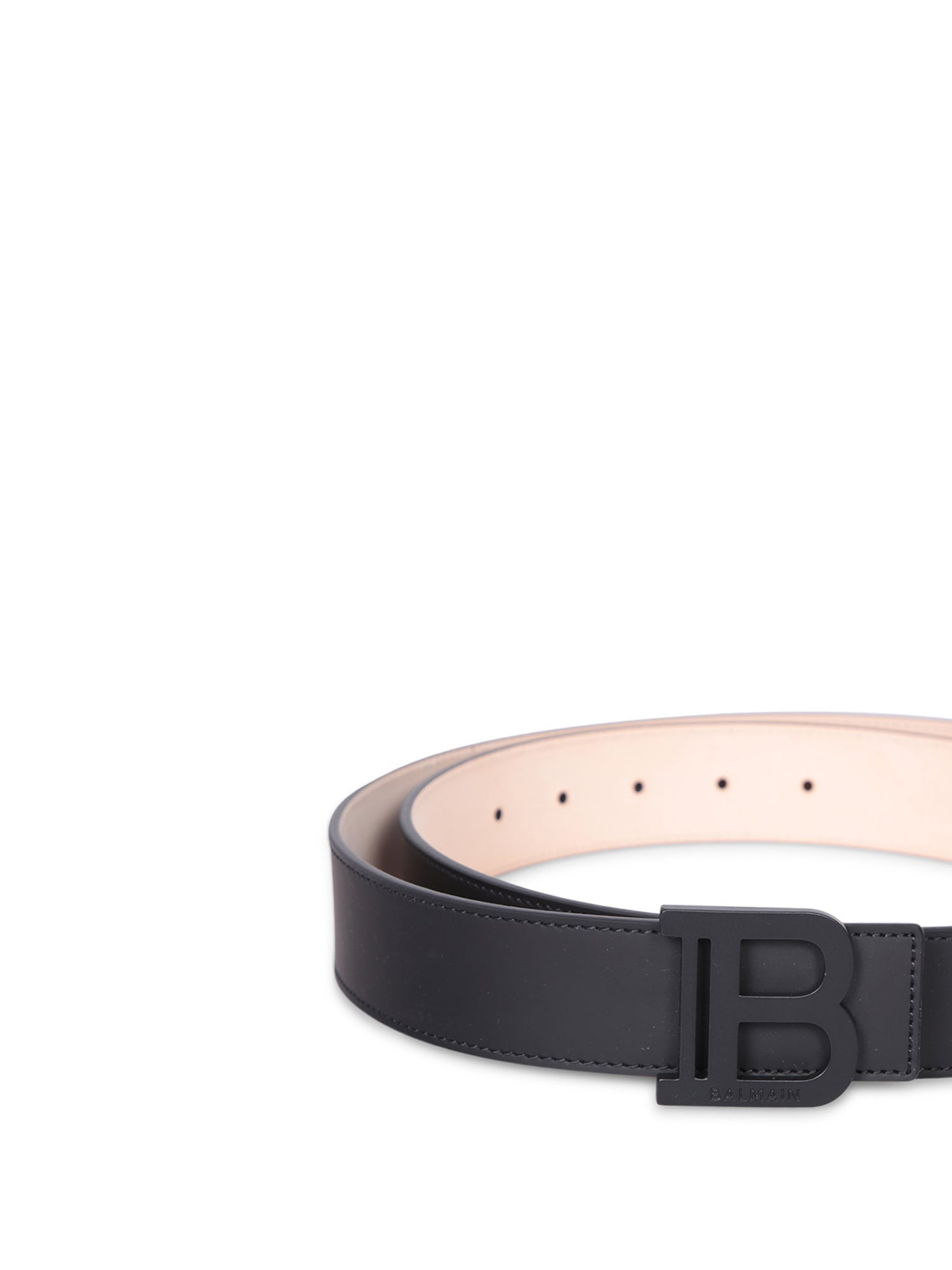 Black leather belt. Oversized 'B' logo buckle. Five adjustment holes.