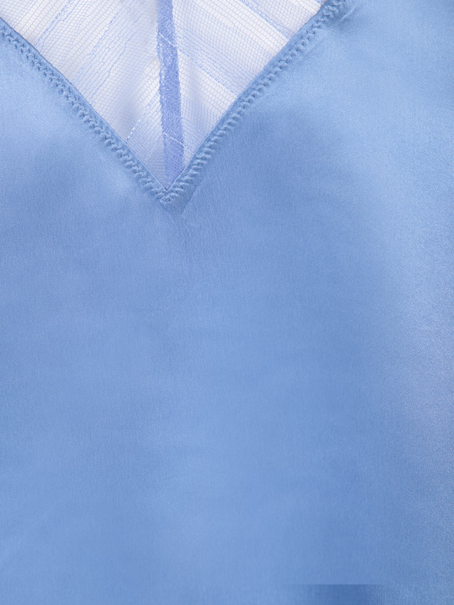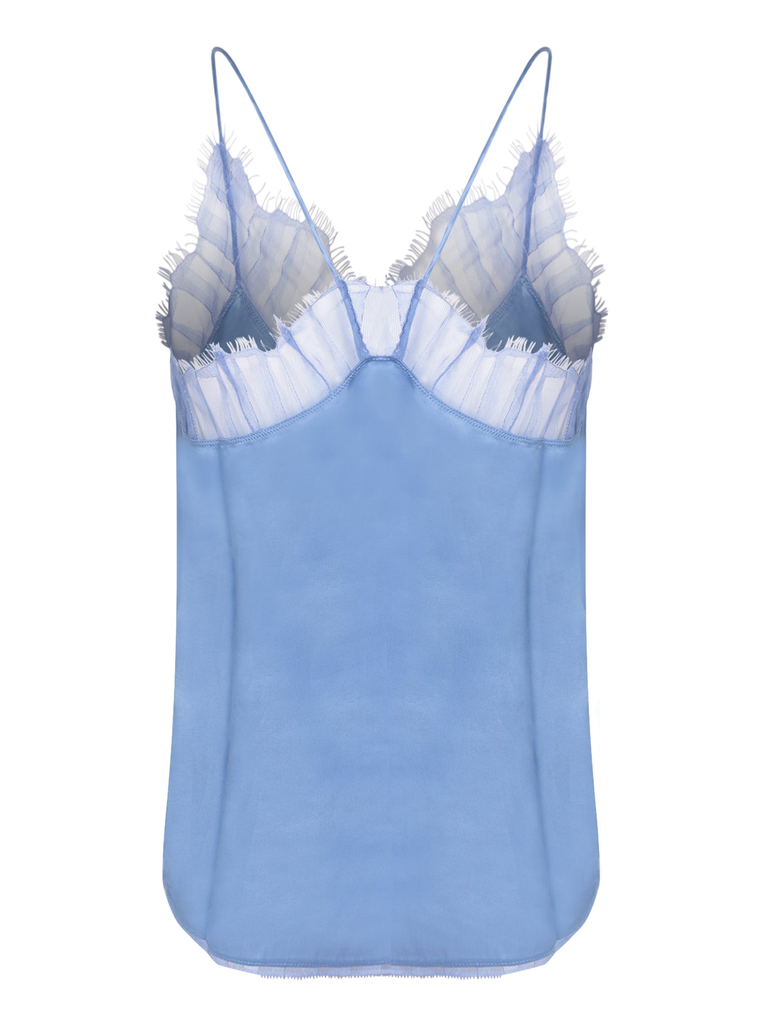 Adjustable thin straps. V-neckline with lace detail. Scalloped hem.