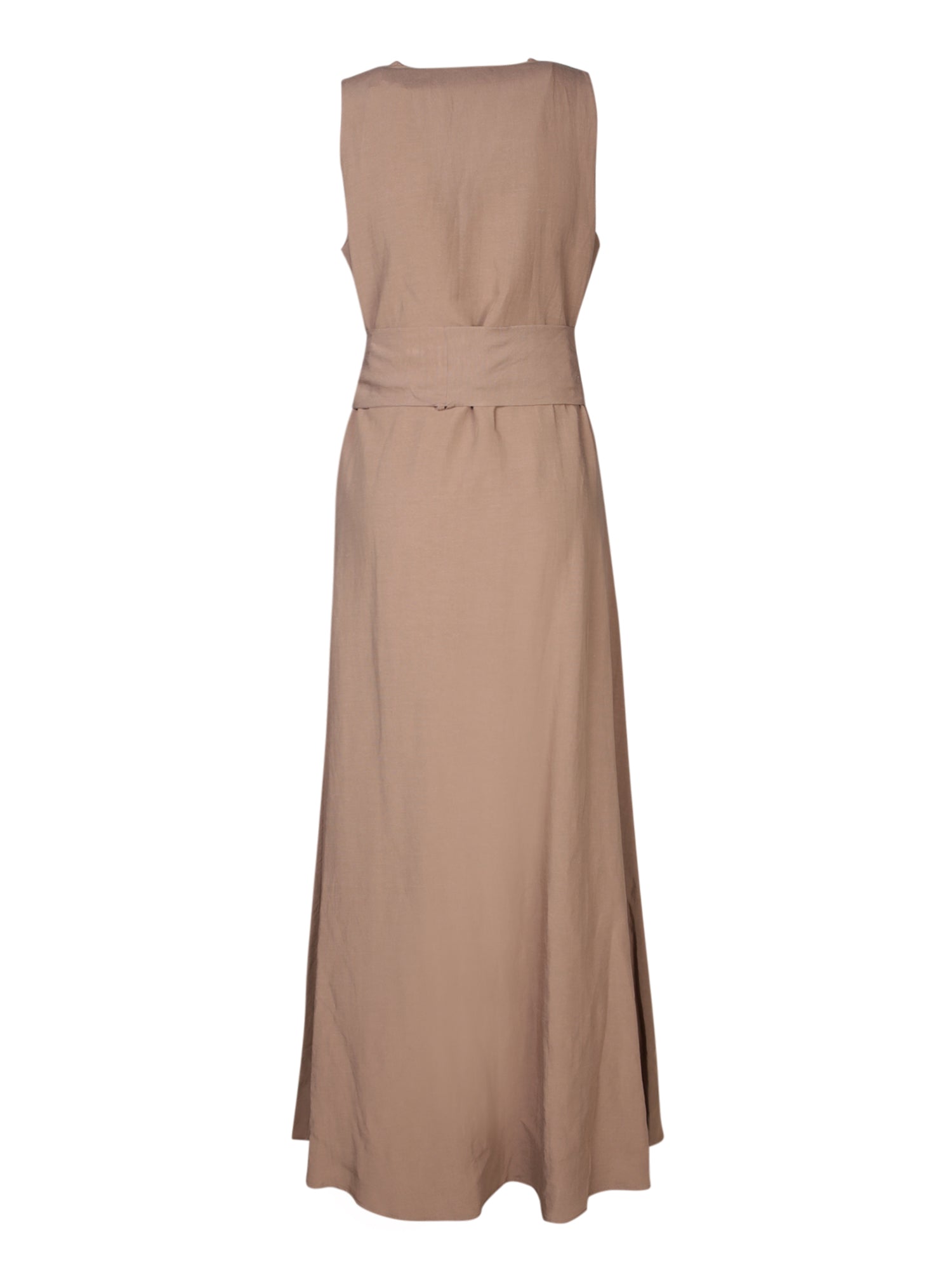 Sleeveless long dress. V-neckline. Matching fabric belt.
