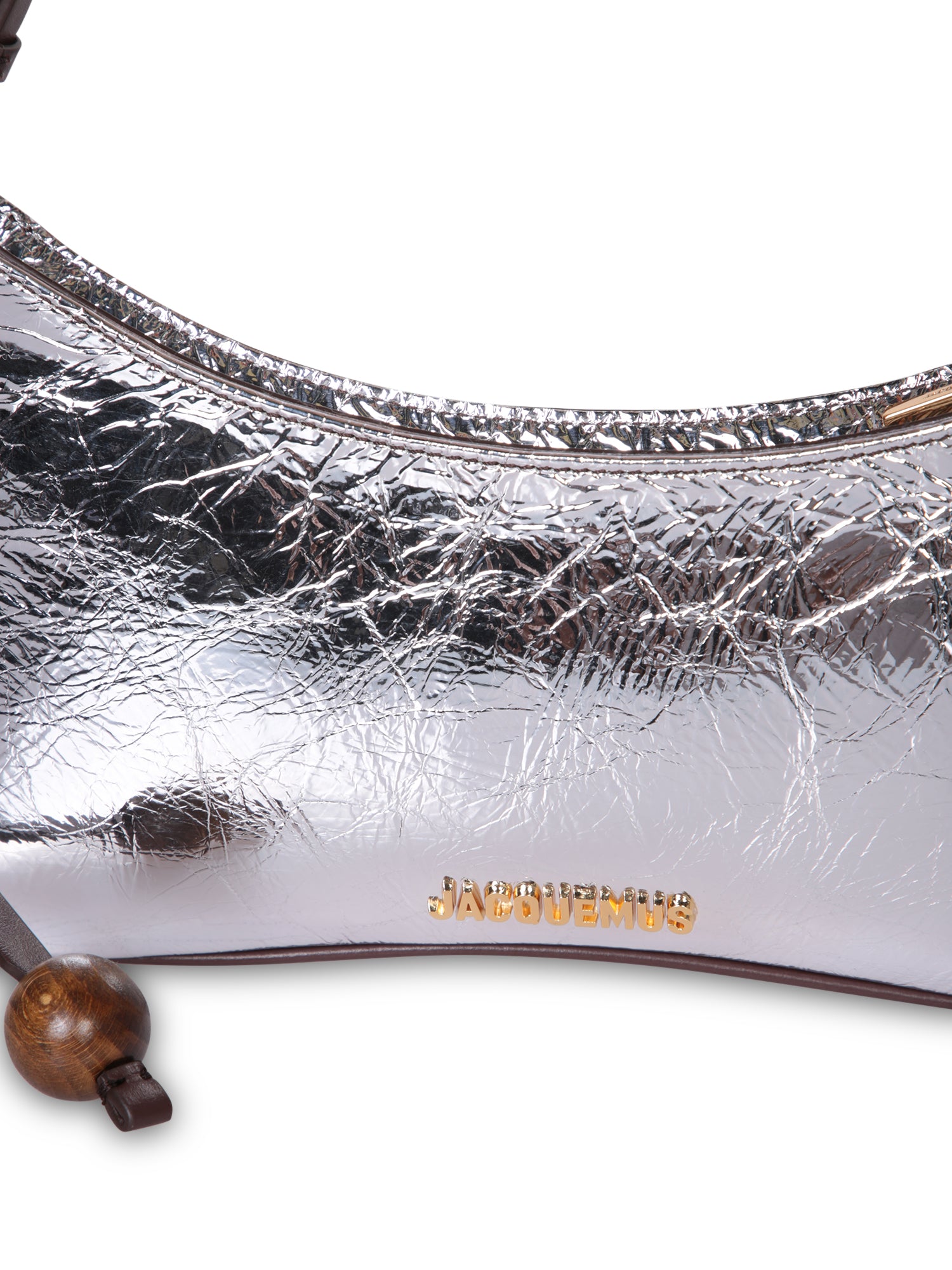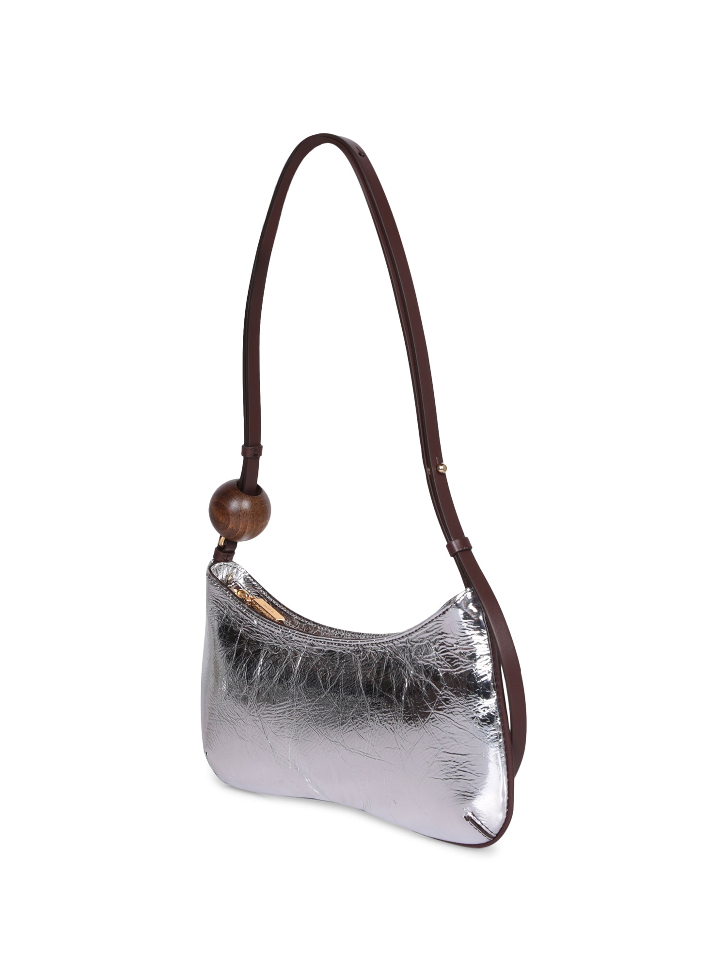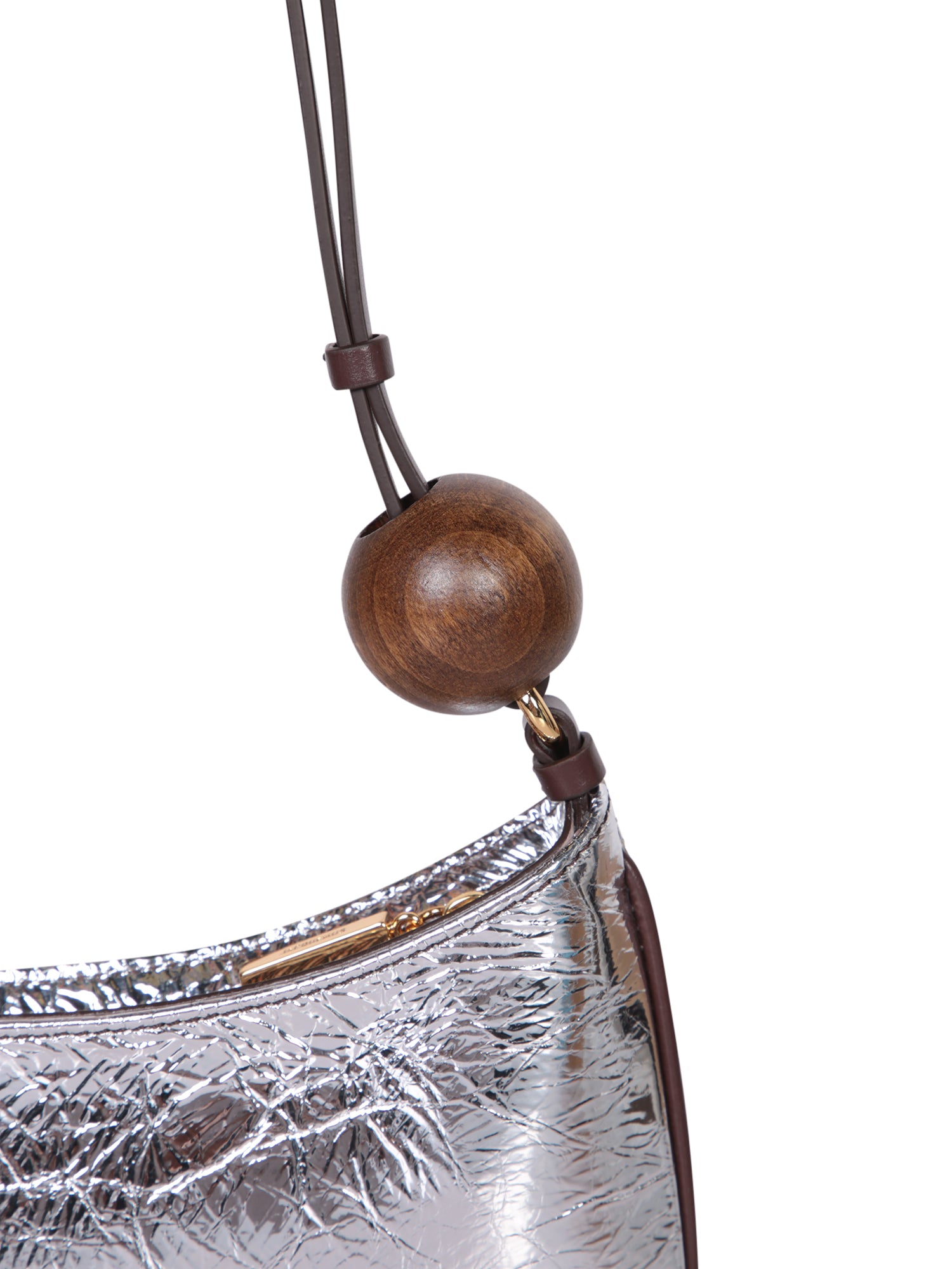 Silver metallic fabric shoulder bag. Brown wood details. Zip closure.