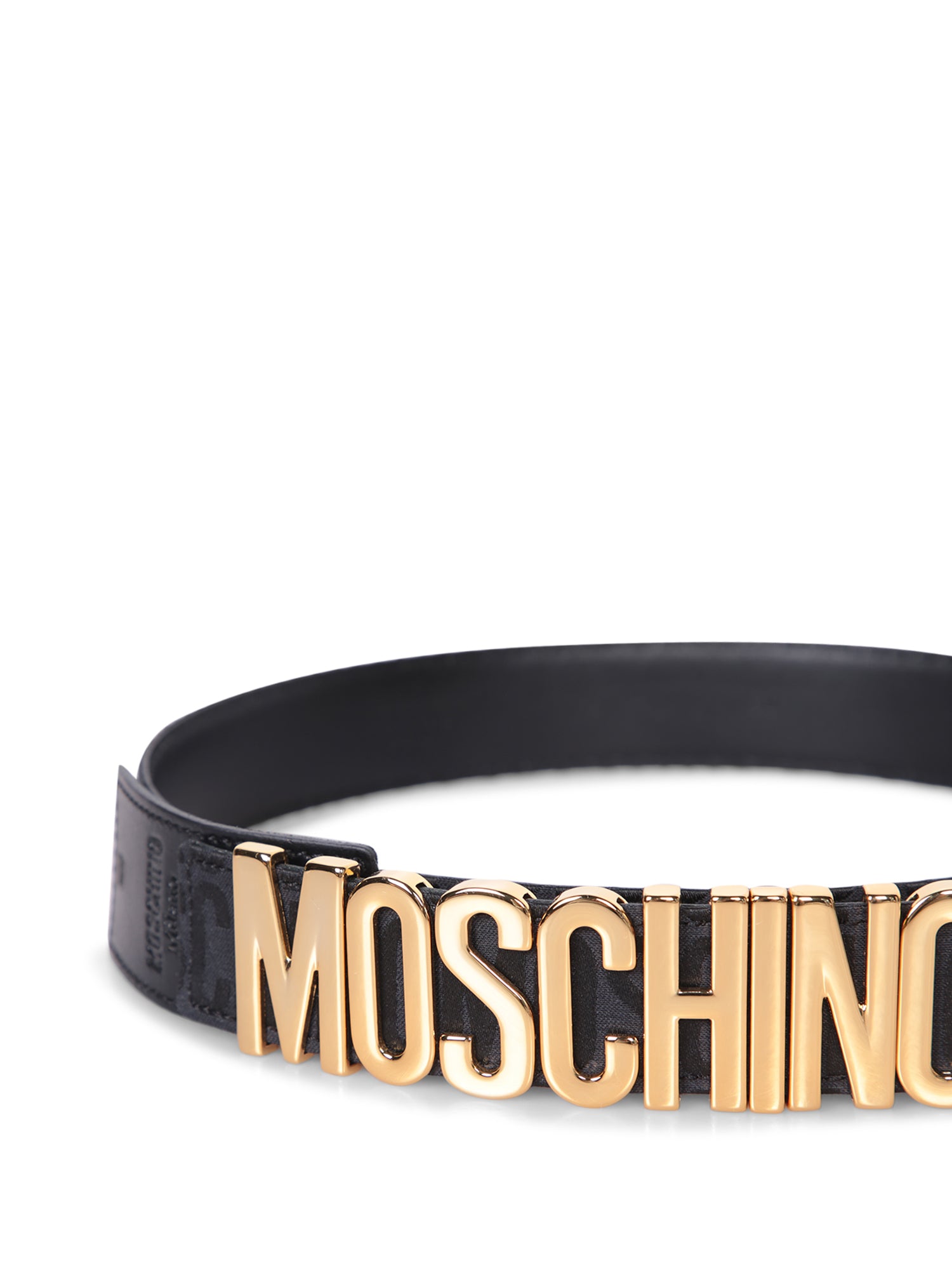 Black leather belt with gold hardware. Large Moschino lettering logo.
