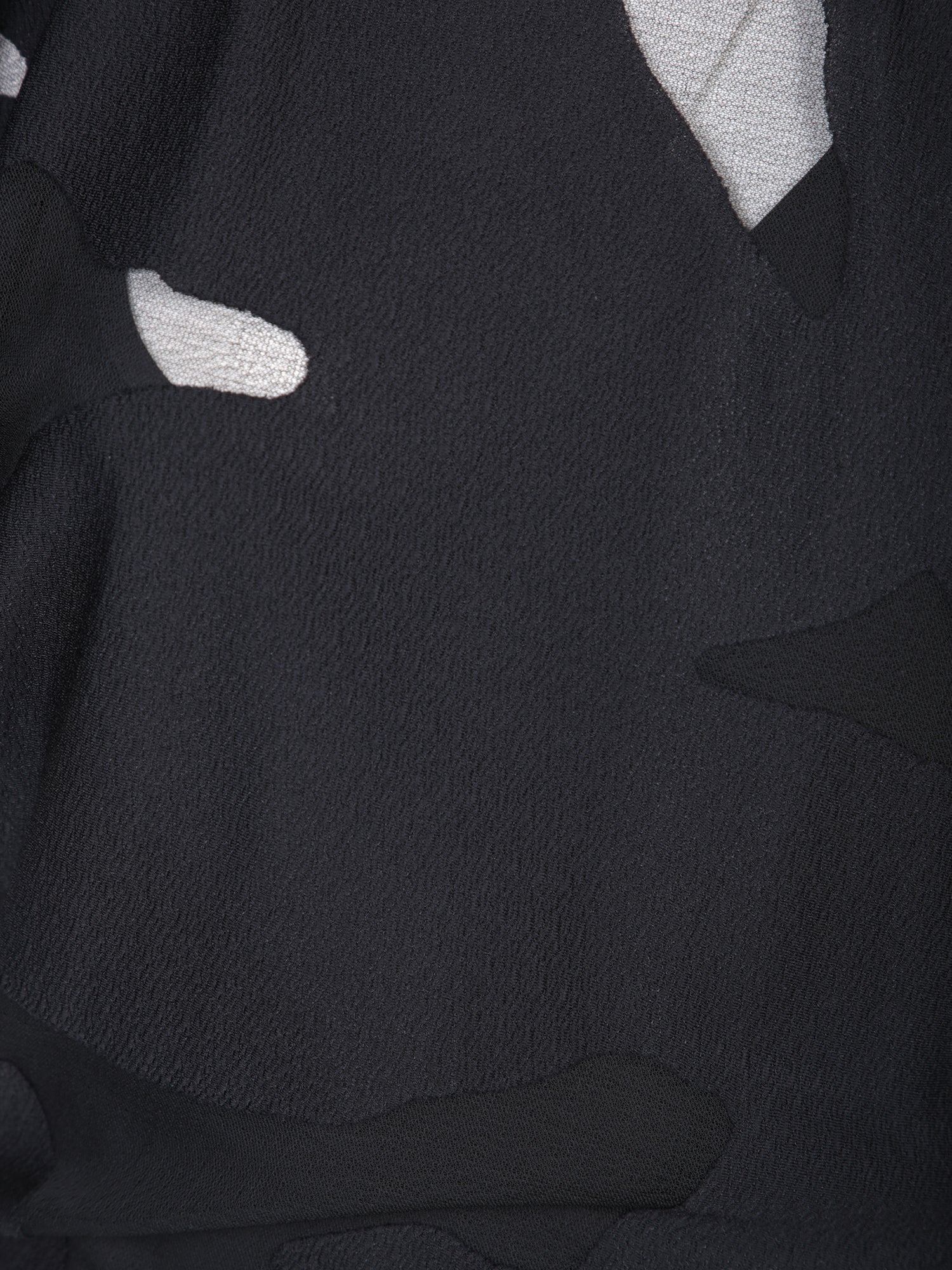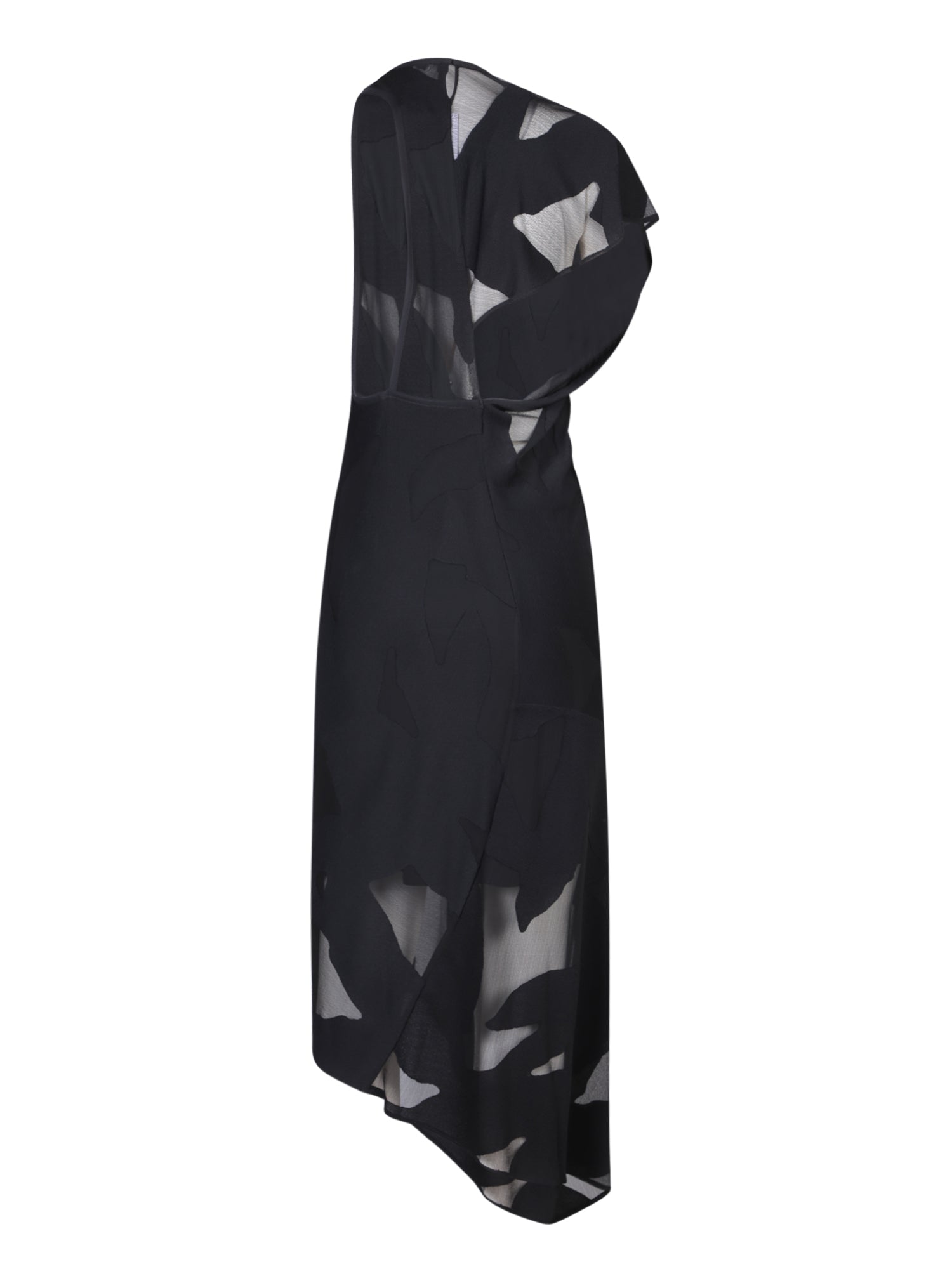 Sleeveless dress with sheer fabric details and geometric pattern. Asymmetric hem finish.
