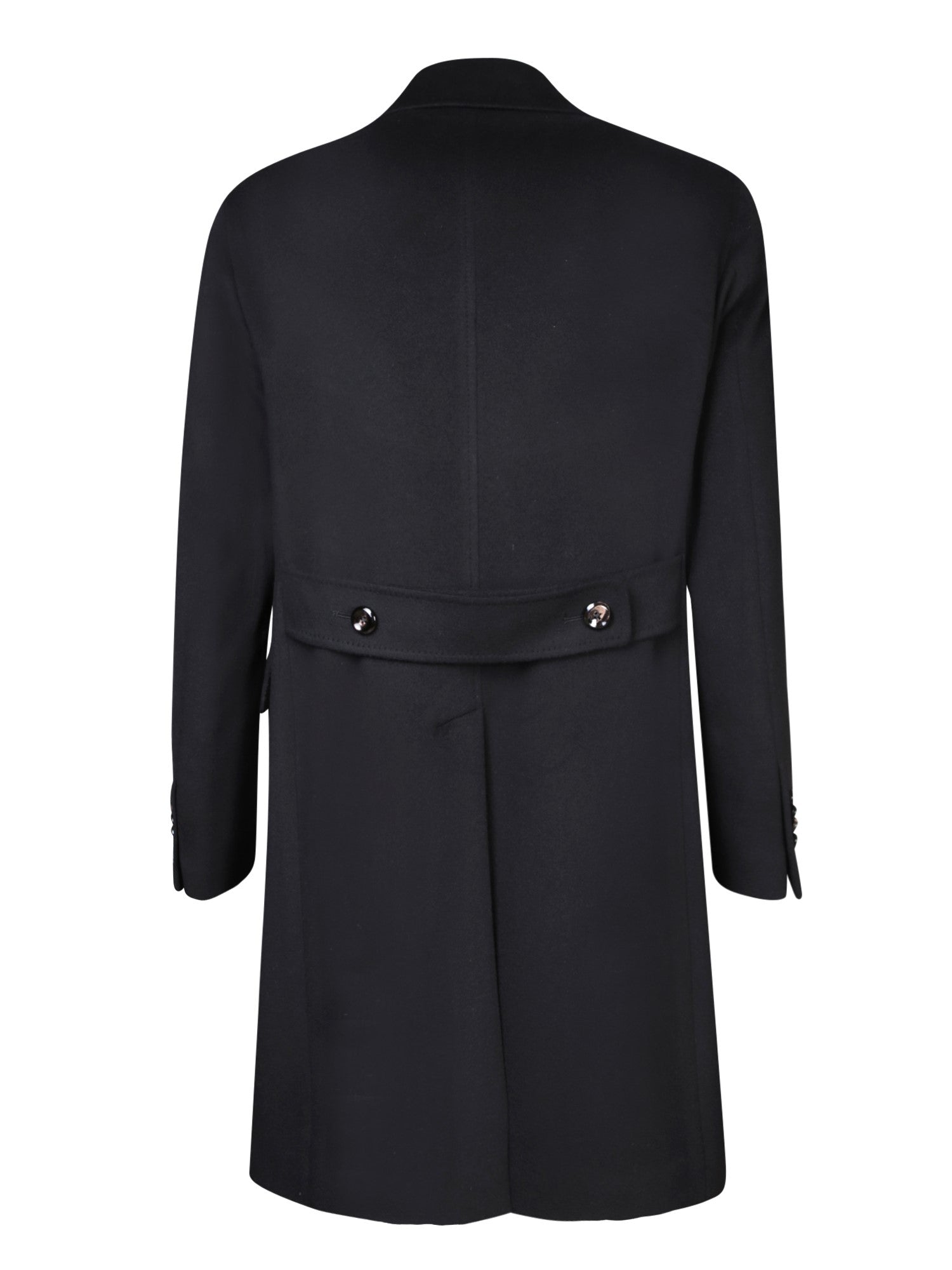Double-breasted coat. Notched collar with martingale detail at the back. Welt pockets.
