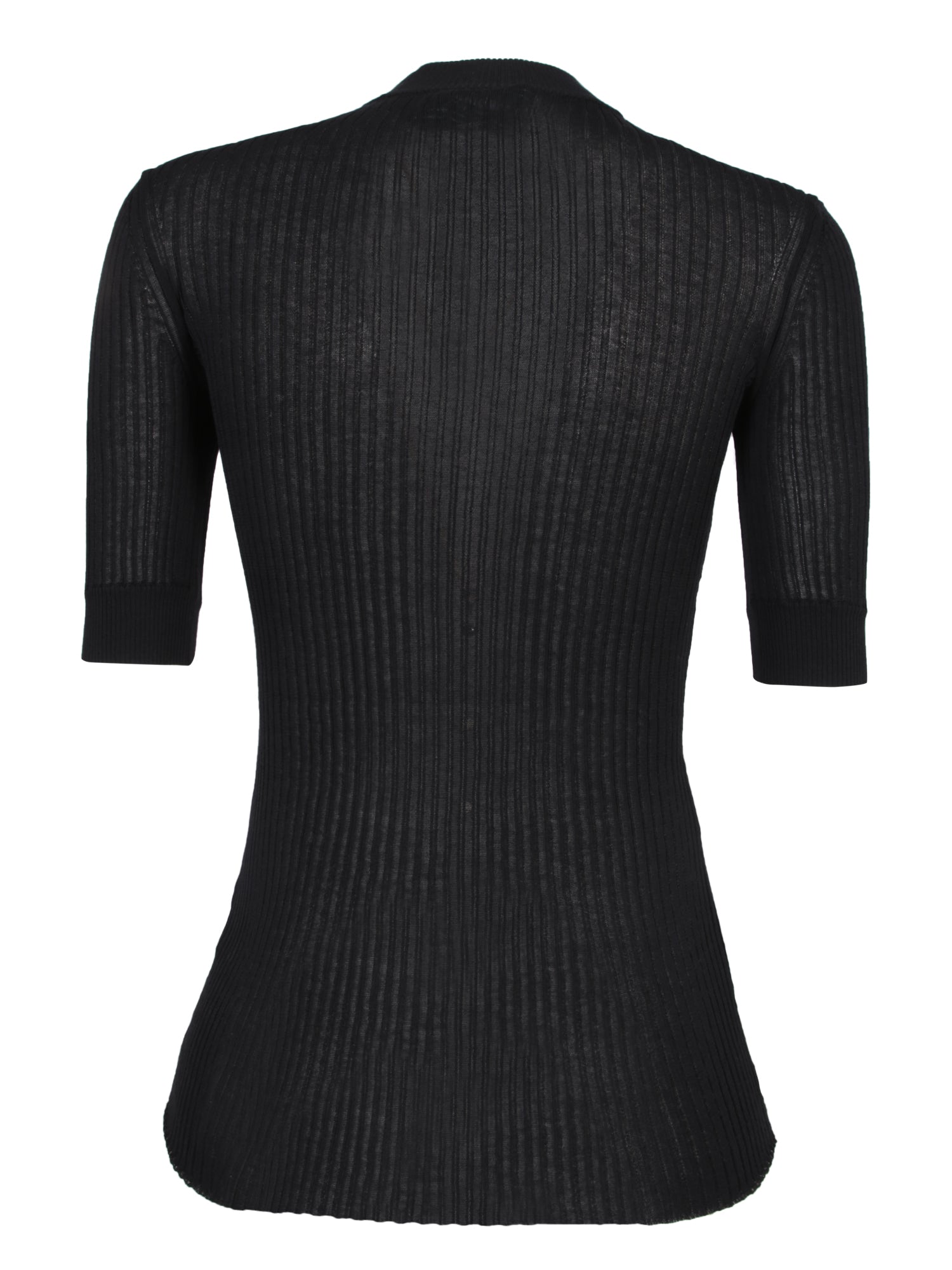 High neck. Elbow-length sleeves. Vertical ribbed design