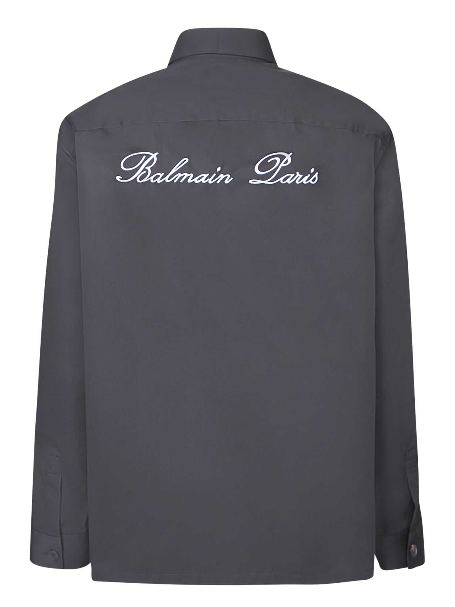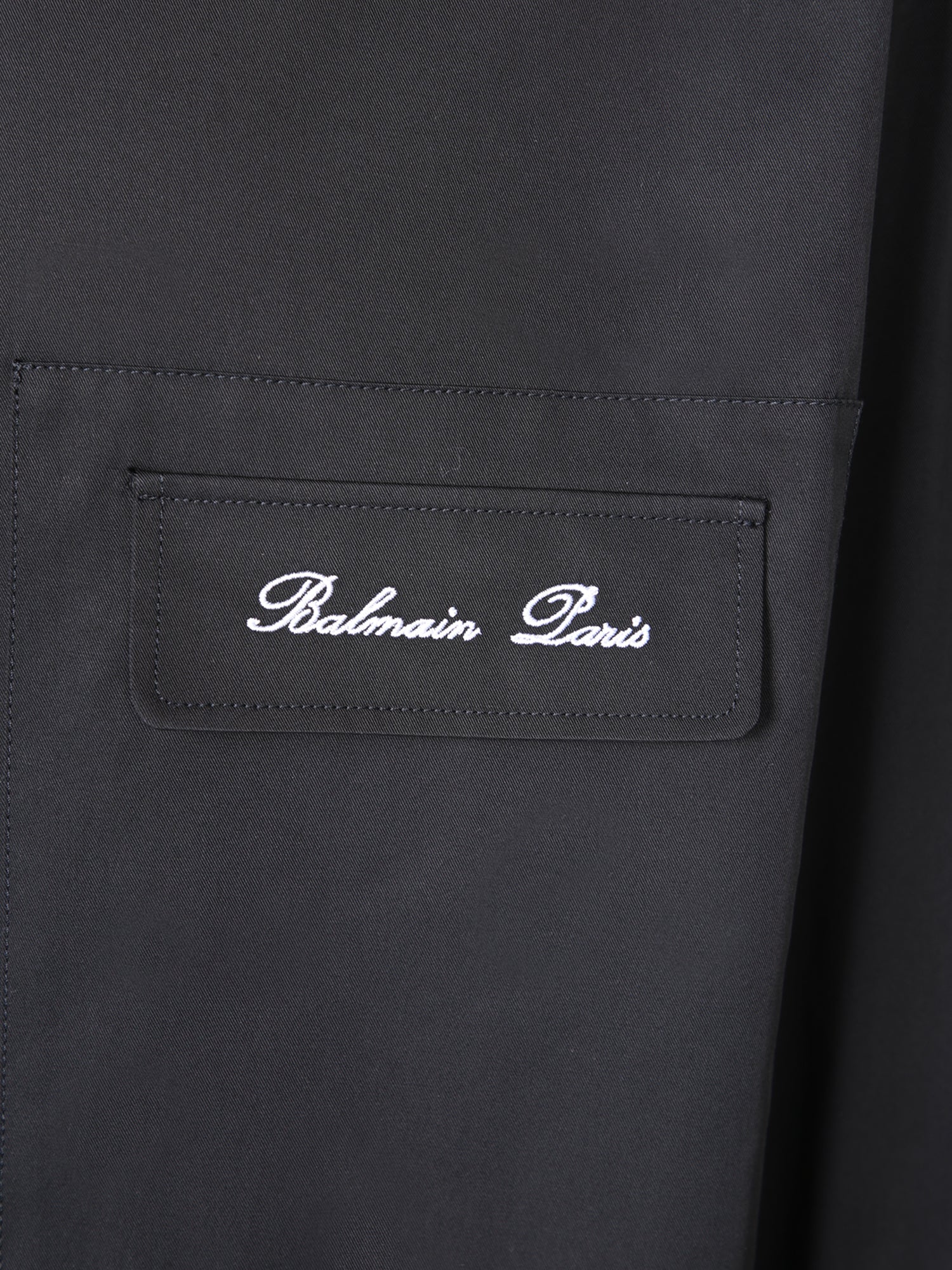 Oversized black cotton shirt. Two front pockets; button closure; classic collar. Embroidered Balmain logo on the pocket.